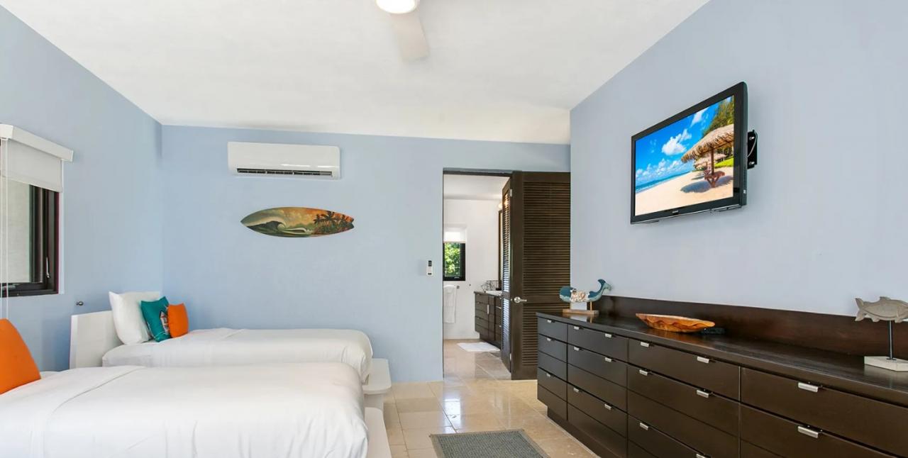 Bedroom 5: This room is located on the ground level and is equipped with two twin-sized beds, air conditioning, a television, a desk, and an ensuite bathroom with a standalone shower.