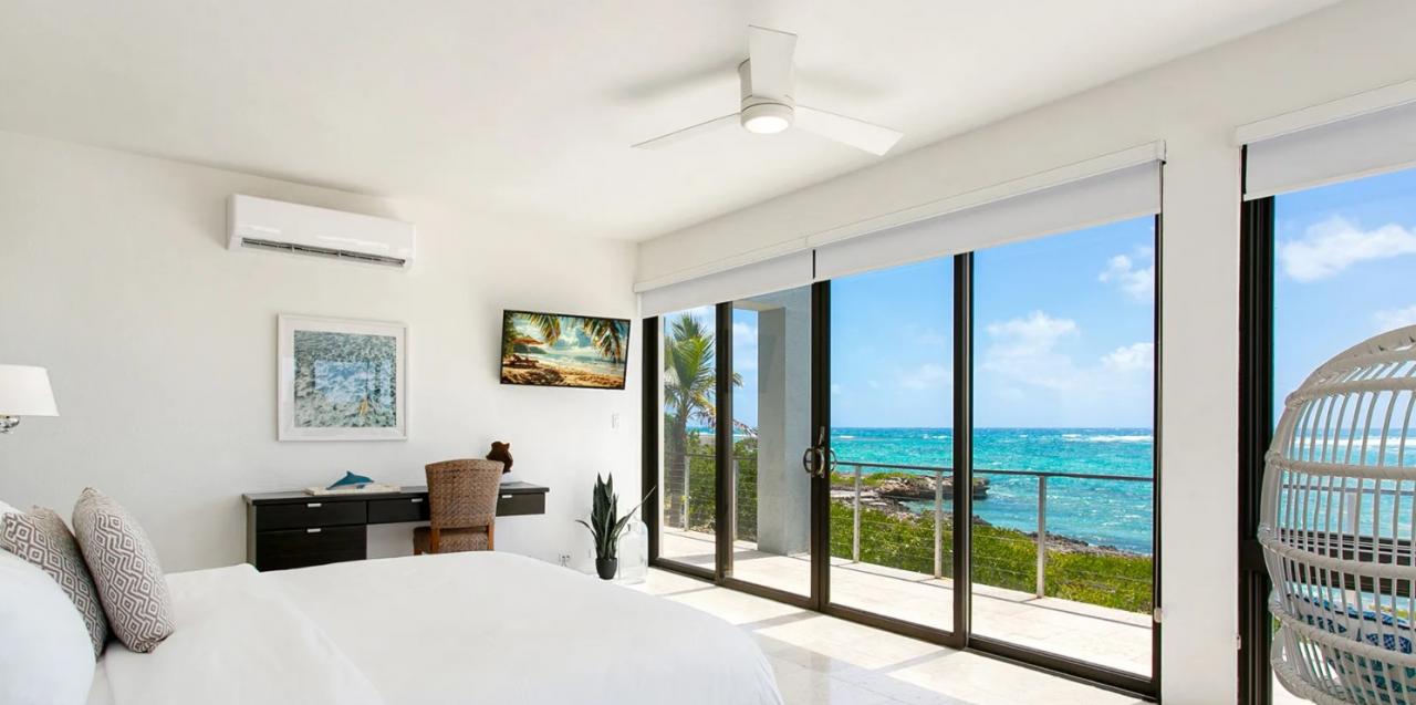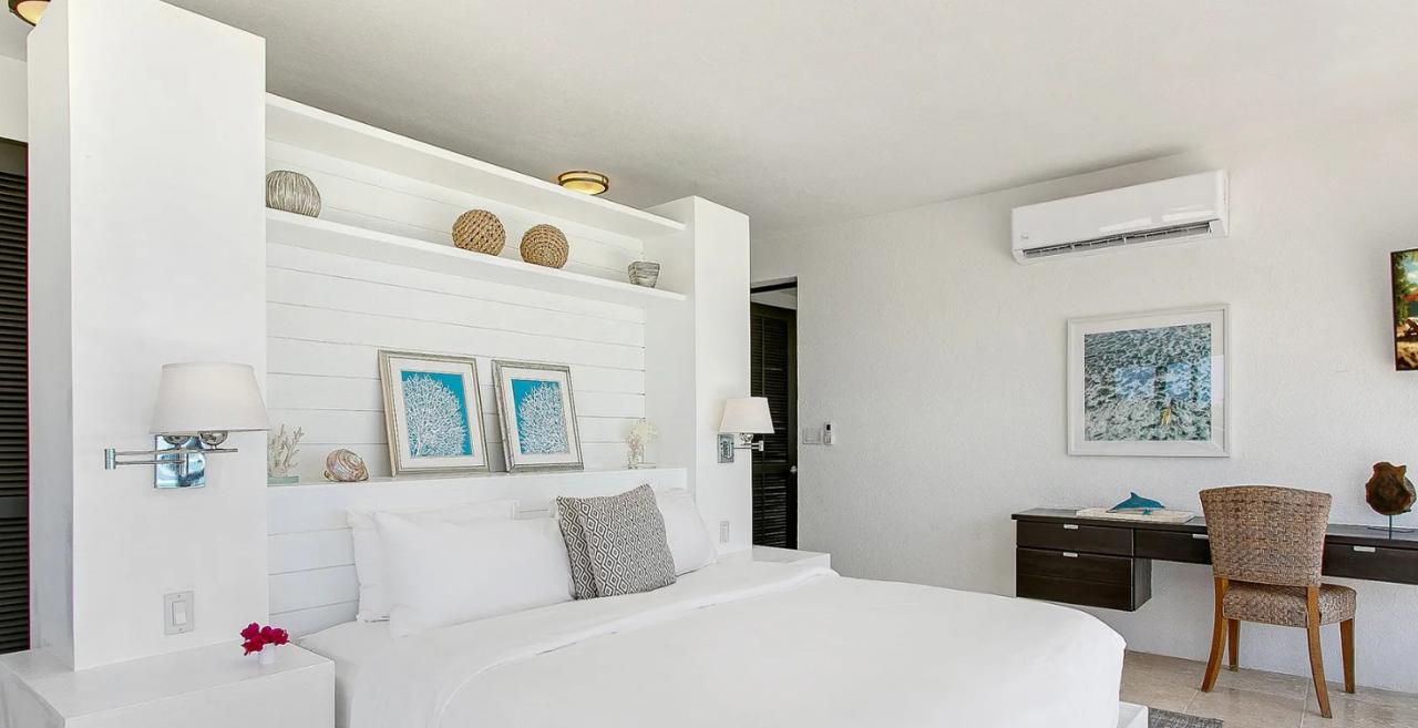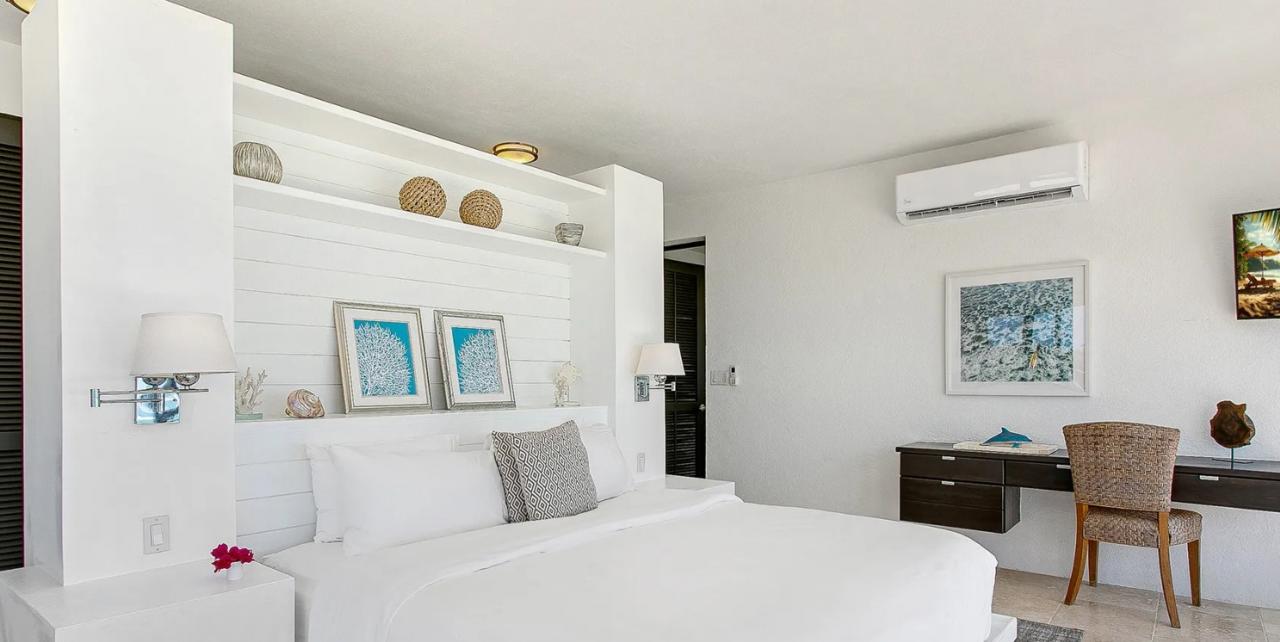 Primary Bedroom: This room is located on the main level and is equipped with a king-sized bed, air conditioning, a ceiling fan, a television, a desk, and an ensuite bathroom with a freestanding bathtub, indoor and outdoor showers, and double vanities. The primary bedroom also opens onto a furnished balcony with views of the Caribbean Sea and St. Maarten in the distance.