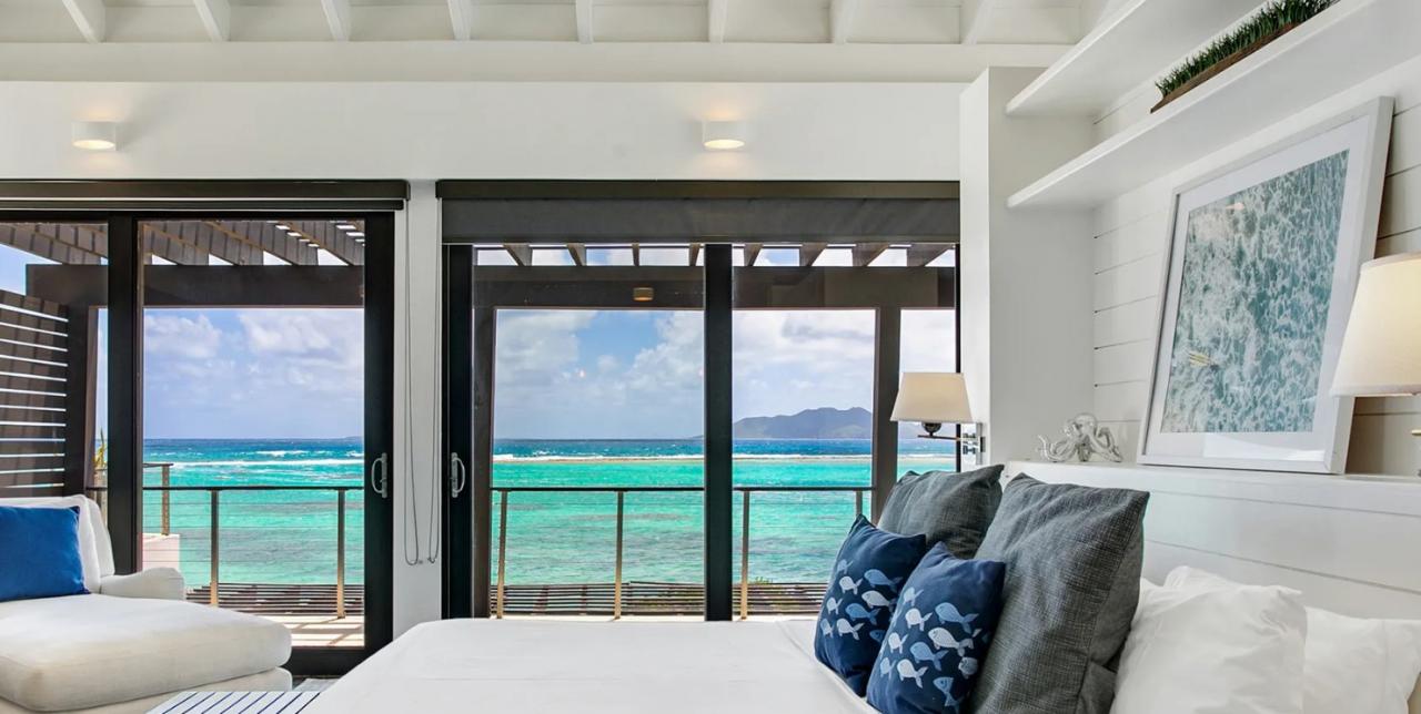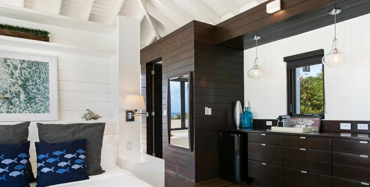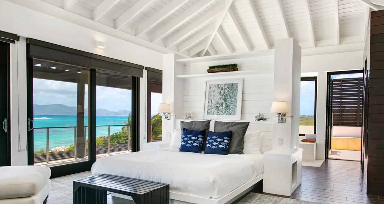 Bedroom 2: This room is located on the main level and is equipped with a king-sized bed, air conditioning, a ceiling fan, a television, and an ensuite bathroom with a freestanding bathtub, indoor and outdoor showers, and double vanities. Bedroom 2 also opens onto a furnished balcony with views of the Caribbean Sea and St. Maarten in the distance.
