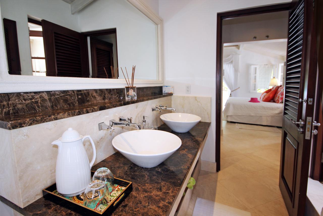 The villa features three air-conditioned en suite bedrooms, with two on the first floor and one on the ground floor. Each bedroom in this Barbados rental opens to a private balcony, ideal for morning coffee or quiet relaxation, and showcases bright, locally inspired decor. The bathrooms include unique outdoor showers, adding to the tropical ambiance.