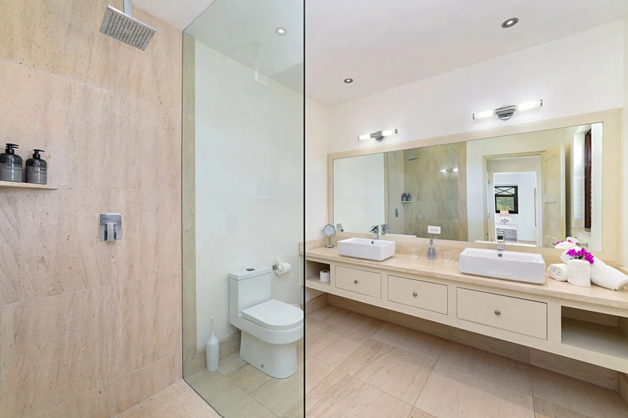 This Barbados villla rental, spread over various elevations, features eight bedrooms, making it an ideal choice for business retreats or group vacations. The south wing on the upper floor houses two bedrooms, each with ensuite bathrooms. Similarly, the north wing is composed of two bedrooms with ensuite baths as well. The ground floor is home to the main bedroom with an ensuite bath, alongside another room with twin beds , complemented by a full bathroom in the nearby study. The basement apartment provides the remaining two bedrooms, one with a king bed and one with two single beds that can be combined to create a king.