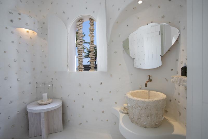 Sustainability and local craftsmanship are at the core of Pebble’s interior design, with elements such as built-in furniture made from a 300-year-old mahogany tree and coral stone details scattered throughout the property. Natural decorations like foraged shells, pebbles, and coral stones further enhance the villa's connection to its coastal surroundings, creating a unique and artful ambiance in this Barbados rental