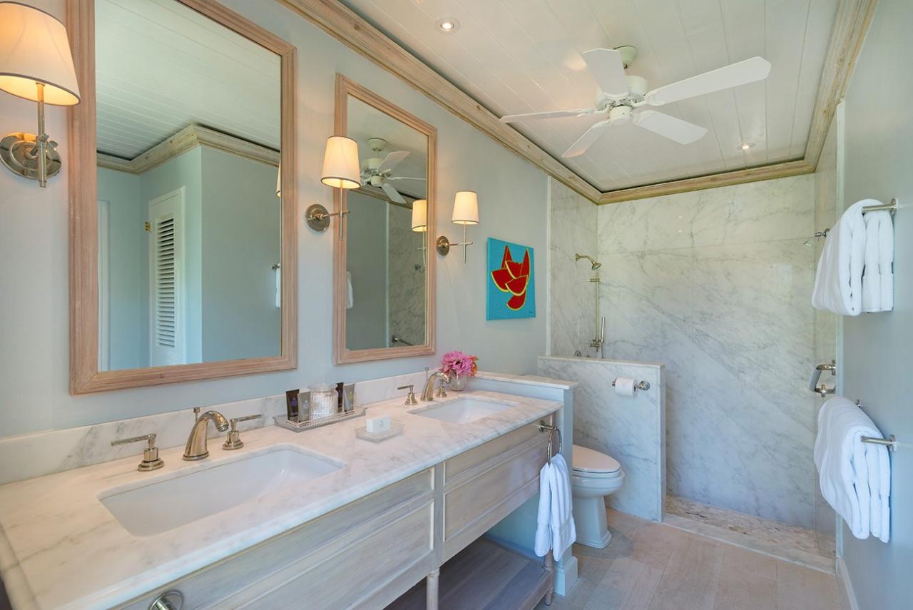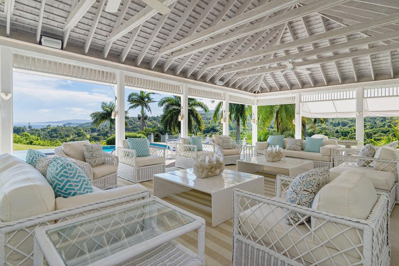 From the Great Room, 18 French doors open to 1,400 square feet of furnished verandahs. Deep cushions cover sofas, chairs, chaises and a wonderful bamboo swing. The view is spectacular day and night. Just beyond the verandah, the private pool spans the front of the house. Adjacent to the pool are the outdoor wet bar and shower and the cutest little powder room in Jamaica.