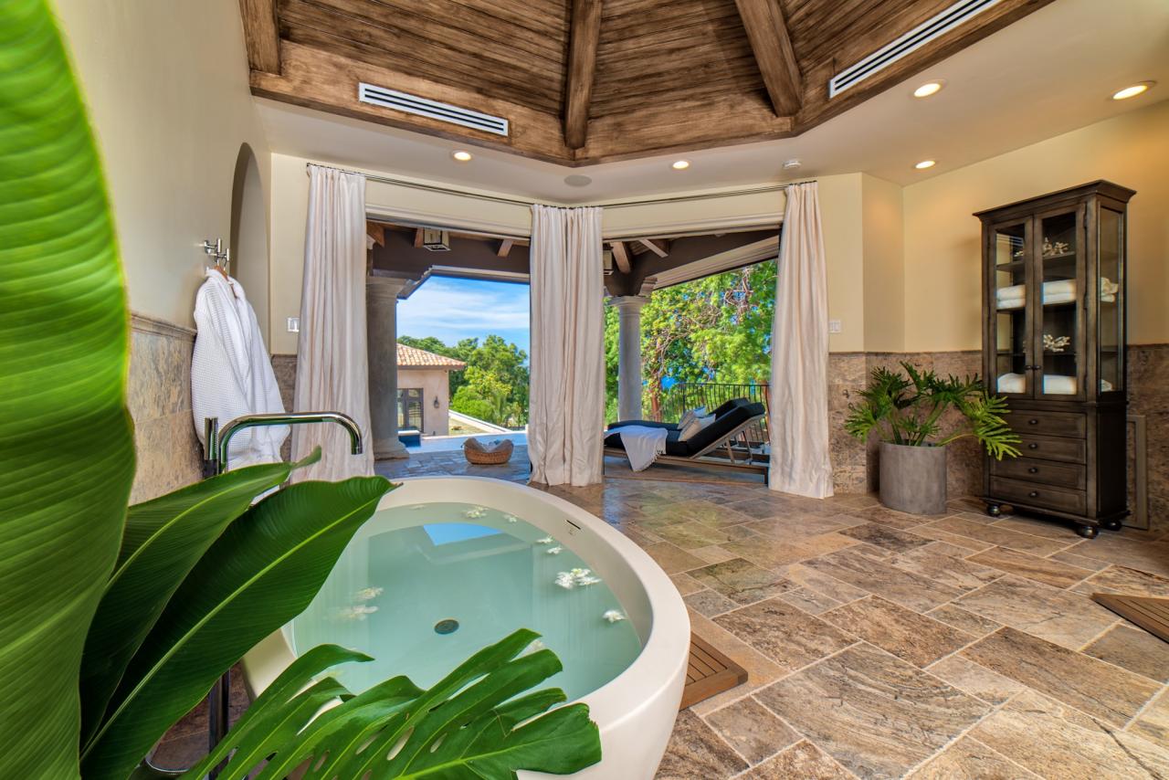 Villa Christina offers five luxury bedroom suites featuring stunning views of the Caribbean Sea and mountains beyond. This villa boasts entertainment areas include a billiards room with wet bar and 8-foot pool table, wellness center inclusive of a spa, exercise room, and steam room, two Jacuzzis, a heated salt-water affinity pool, TV lounge and entertainment area, covered terrace, and romantic lookout tower.