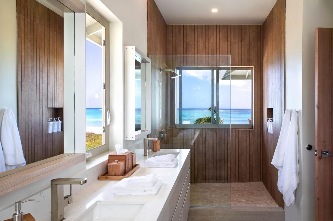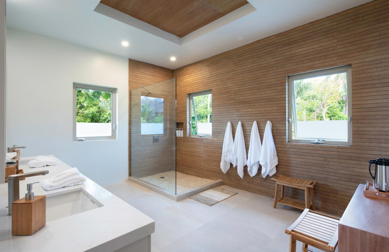 Bedroom 2: This room is equipped with a king-sized bed, air conditioning, a ceiling fan, black-out curtains, a smart TV, a personal safe, and an ensuite bathroom with double vanities and a walk-in shower. Bedroom 2 also has a sea-view terrace with comfortable seating.