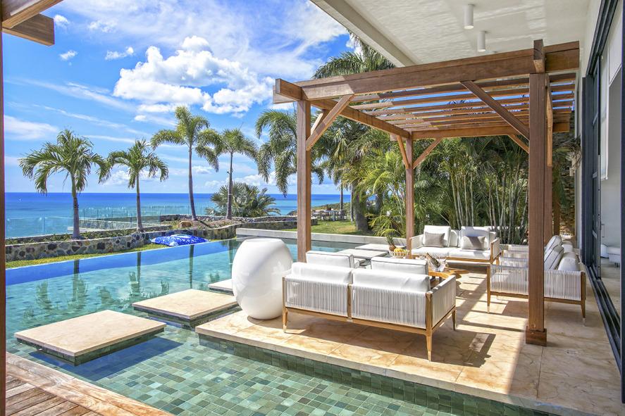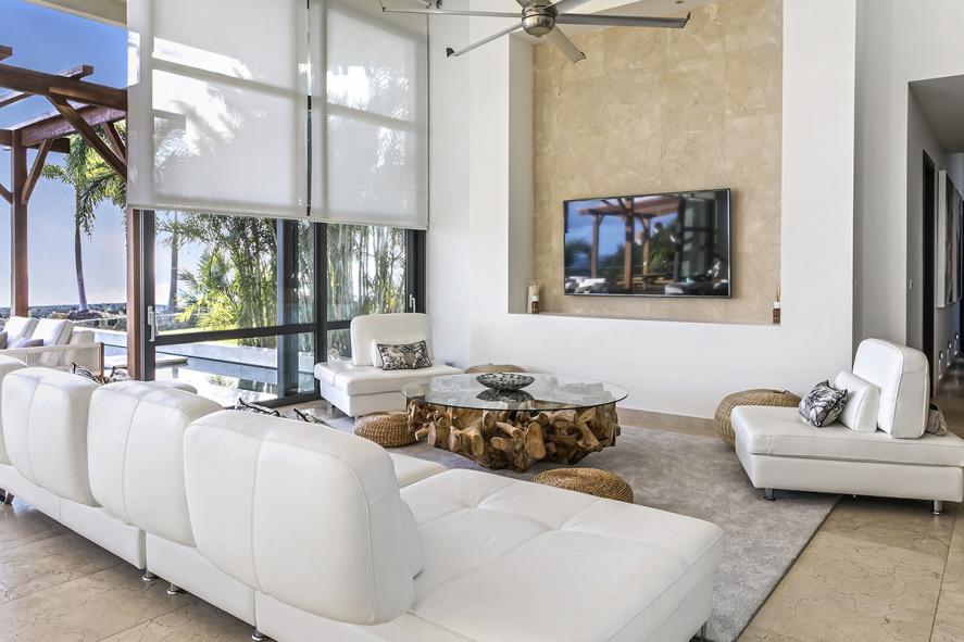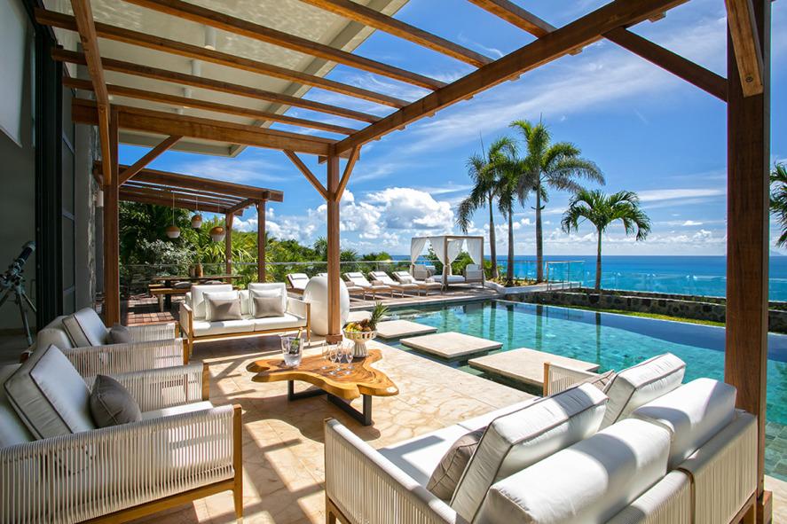 The villa has gorgeous outdoor spaces to enjoy the Caribbean tropical climate. A large shaded living space just steps from both the pool and the inside provides the perfect place to relax any time of the day. The beautiful infinity pool includes built in steps from the outdoor living room to the dining space. Another terrace features daybeds for a sunny spot to lounge by the pool and enjoy the views. At the end of the day, the villa is the perfect place to enjoy a bright and colorful sunset. Have a drink, get comfortable and enjoy the breathtaking view.