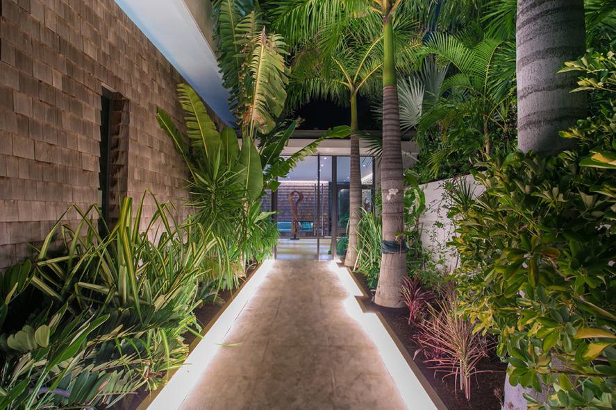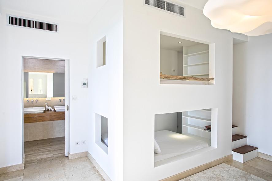 The first three bedrooms are located on the main level, including the master suite, which opens directly onto the tropical garden, offering a refreshing and exotic start to each morning. One of the other two rooms features two large bunk beds, providing the ideal setup for children and close proximity to the master bedroom.