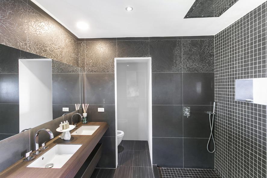 The remaining two bedrooms are located upstairs. One of them features its own private terrace with a jacuzzi, creating a secluded space for relaxation. Each of these rooms has its own ensuite bathroom.