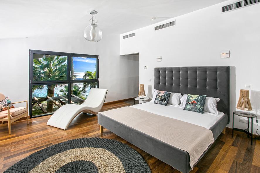 Find the magic of Emeraude upon entering, when you discover several indoor ponds filled with beautiful colorful fish creating a decorative and soothing water garden. This amazing entrance leads to a beautiful interior living space with high ceilings facing the swimming pool and the azur sea. An elegant yet comfortable living room blends with the outdoor ocean colours while the large solid wood dining table joins the space to the fully equipped kitchen with all the latest appliances. Special to the kitchen is the hidden pantry. Meals can also be taken outside around the beautiful table near the pool.