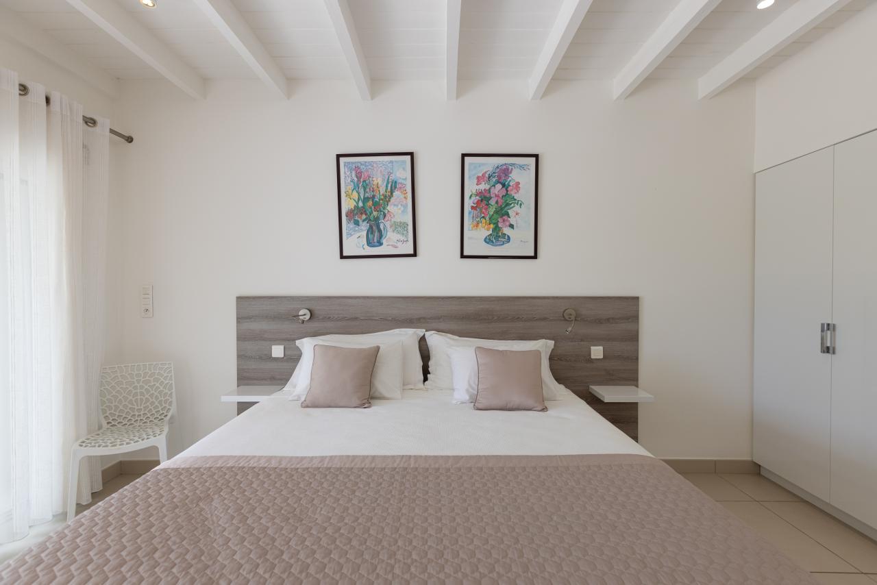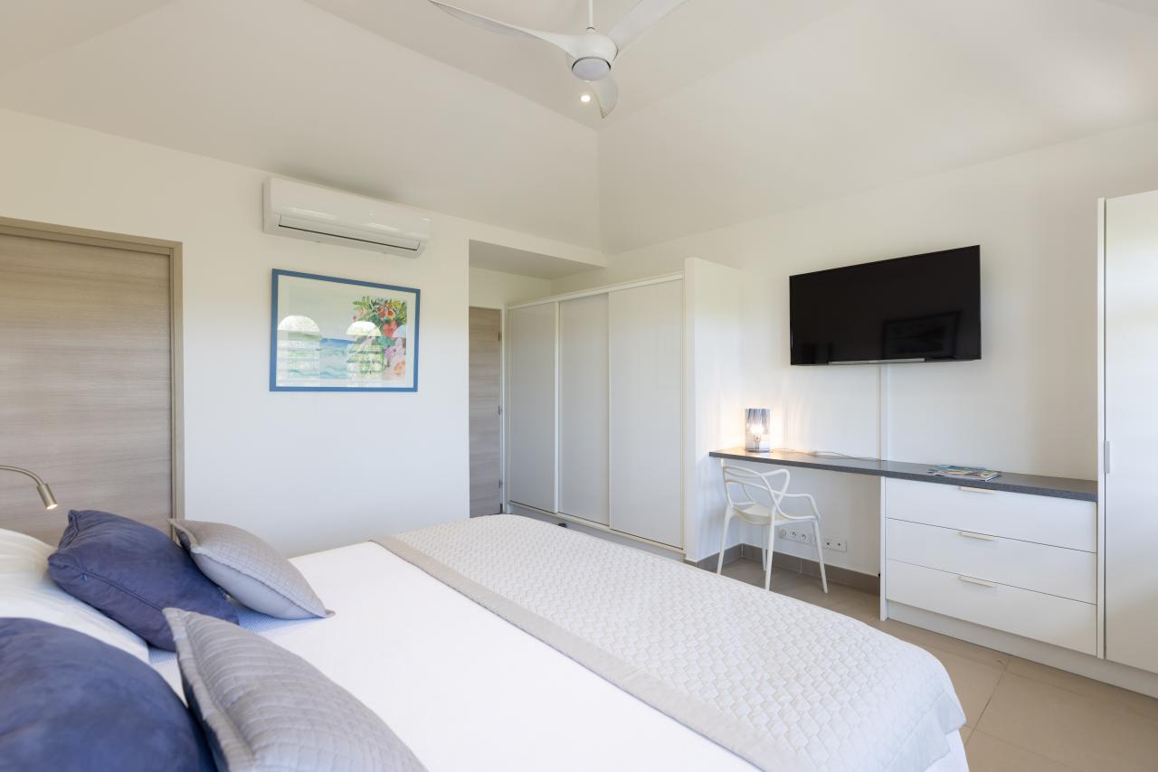 Bedroom 2: This room is equipped with a king-sized bed, a garden view, air conditioning, a TV, a DVD player, a safe, and an ensuite bathroom.
