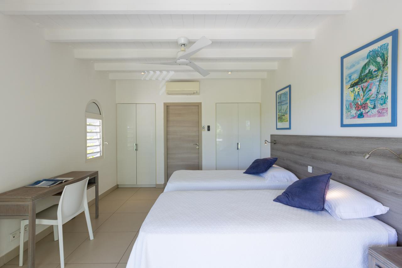 Bedroom 5: This room is equipped with a twin-sized bed, a garden view, air conditioning, a TV, a DVD player, a safe, and an ensuite bathroom.