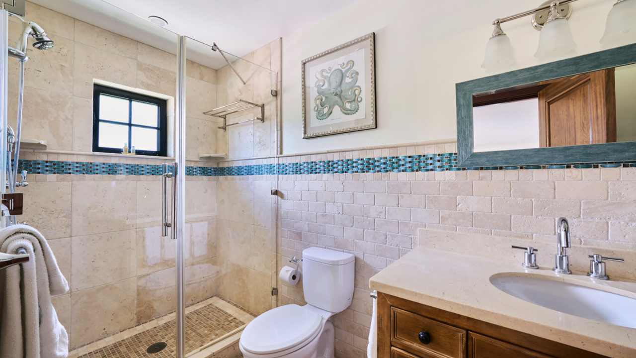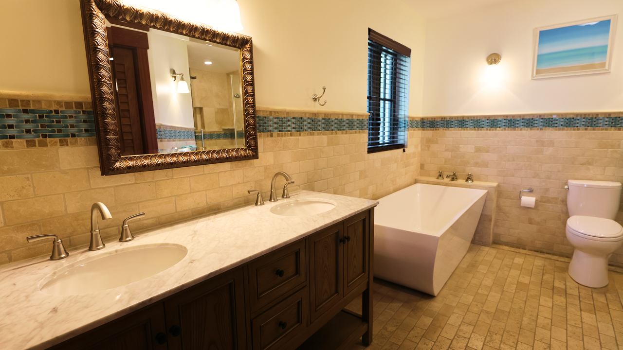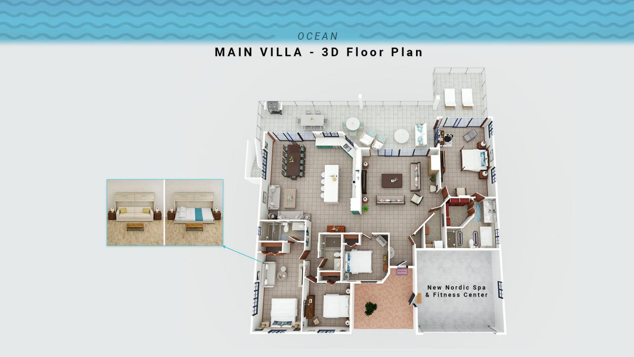 •   Main Suite: King bed, walk-in closet, private ensuite bathroom, ocean + pool views