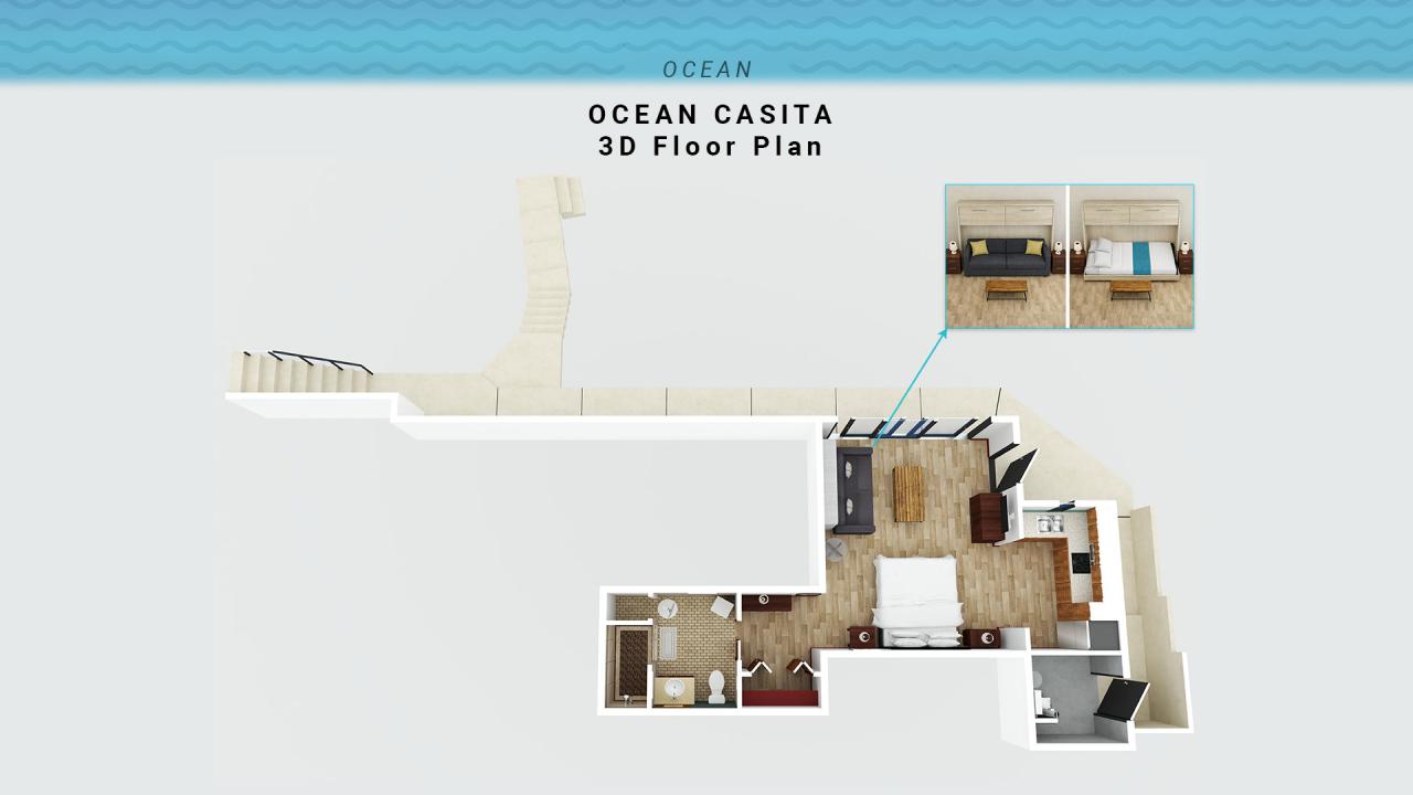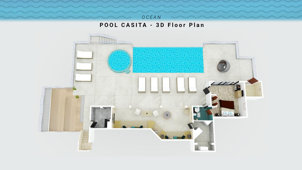 •      Pool Casita: King bed, private ensuite bathroom + outdoor shower, ocean + pool views
