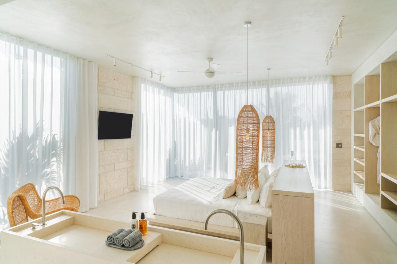 Main House: The main house has three bedrooms upstairs; all rooms have king-sized beds, a balcony, a TV, an open-concept closet with a safe, and an ensuite bathroom with double sinks.