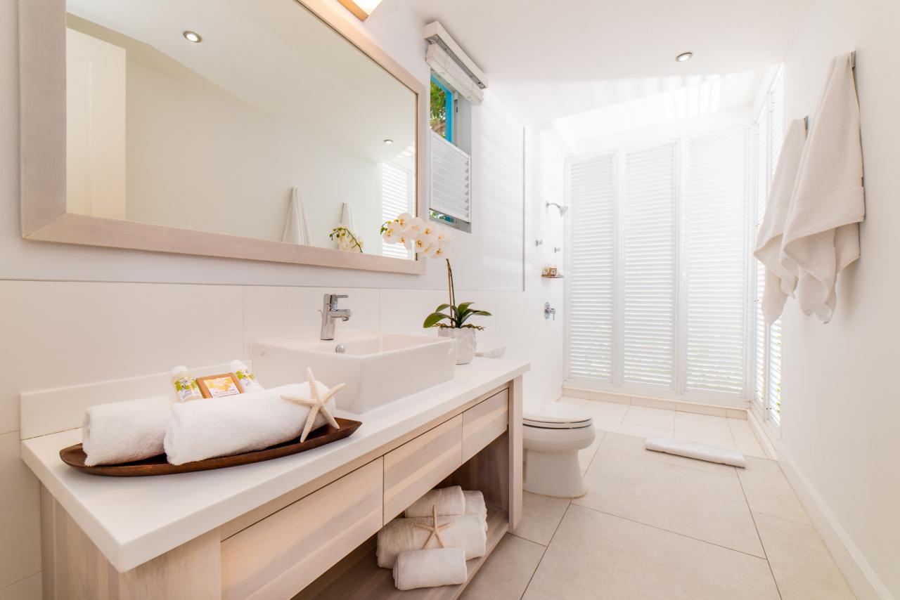 Primary Bedroom: This room is located on the upper level. It is equipped with a king-sized bed, air conditioning, a ceiling fan, a safe, and an ensuite bathroom with a walk-in shower and feature soaking tub. This room also has a balcony with an ocean view that is shared with bedroom 2.