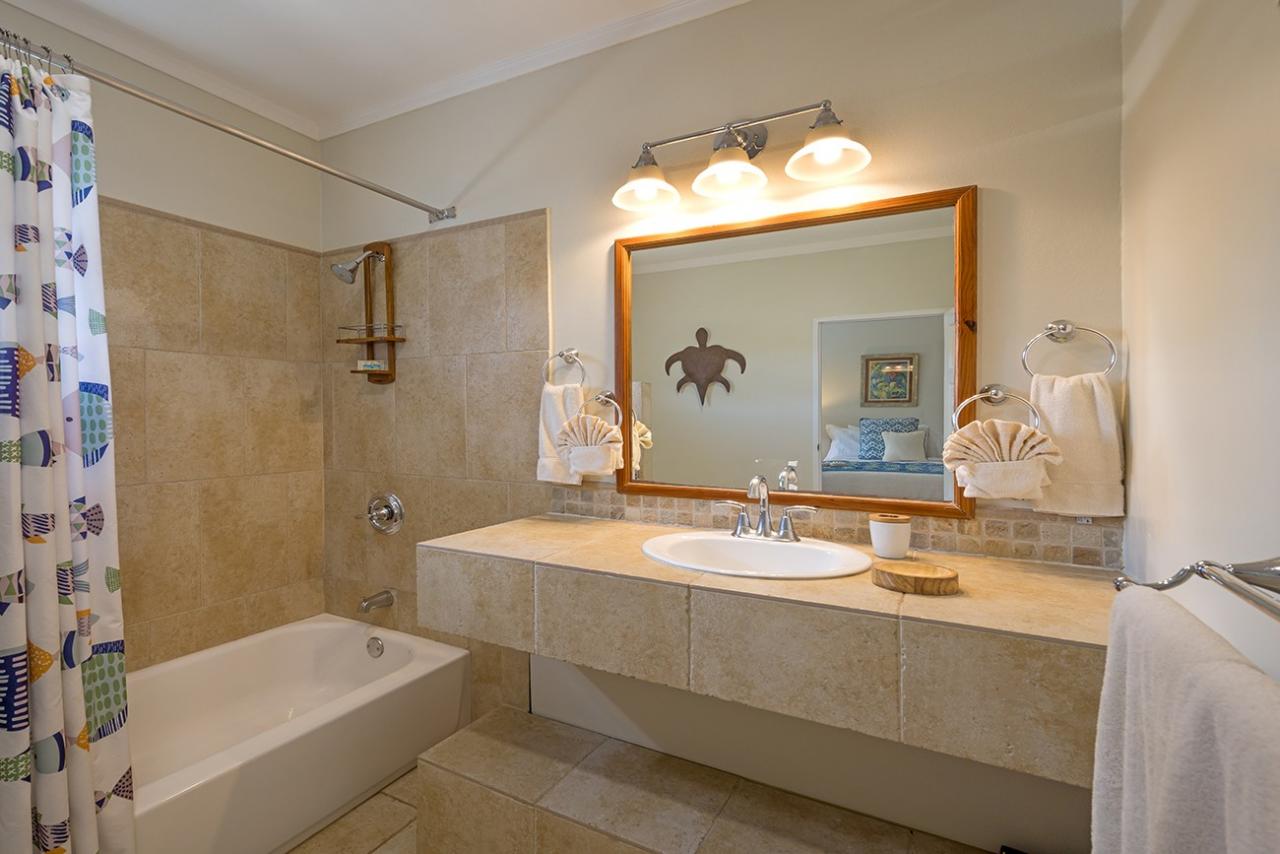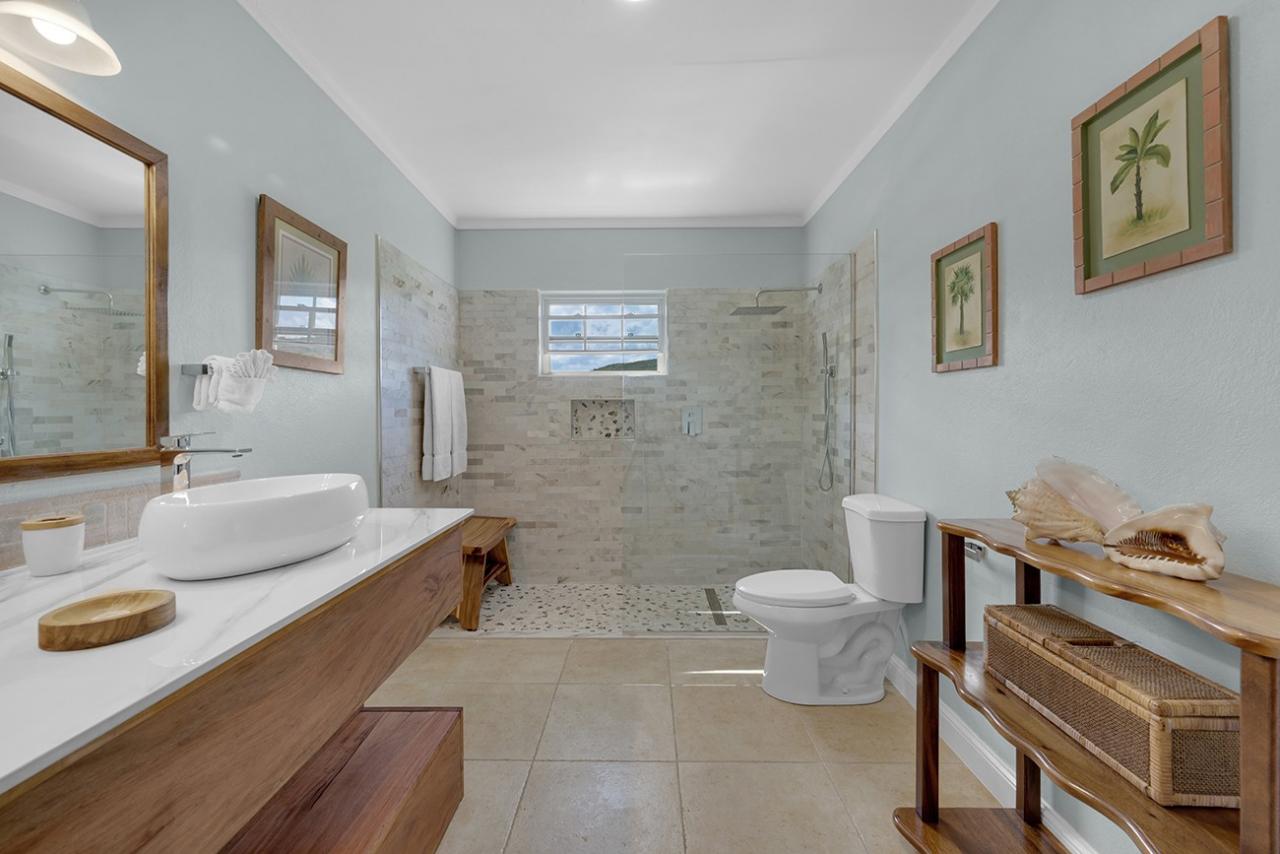 Bedroom 2: This room is located on the upper level. It has a king-sized bed, a closet, and French doors that open to a private balcony with a sea view. Bedroom 2 has an ensuite bathroom with double vanities and a large walk-in rain shower.