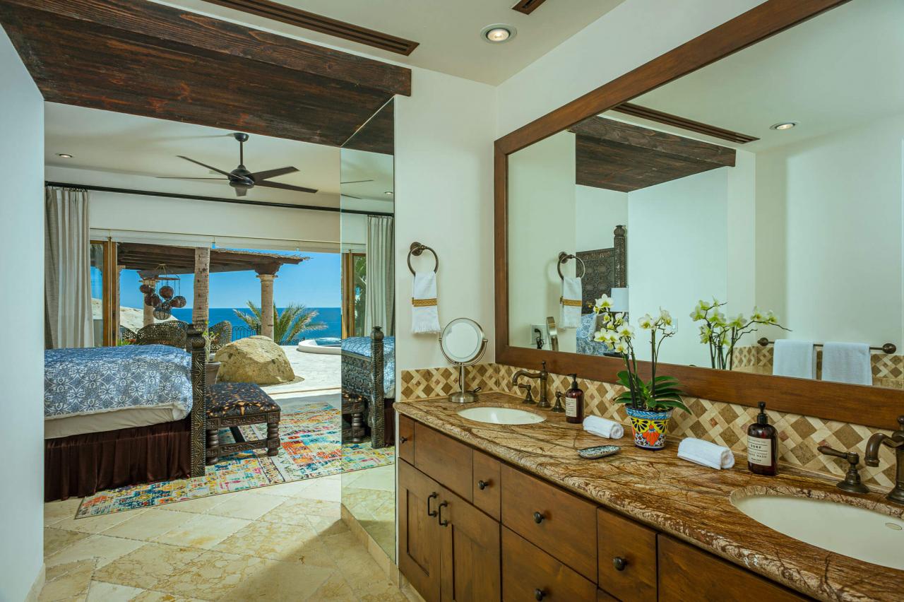 This Los Cabos villa rental features a grand entrance, a two-story great room, a chef's kitchen, a media room, and six bedrooms, including four master suites with private terraces. There's also a guest casita with its own kitchenette and bath.