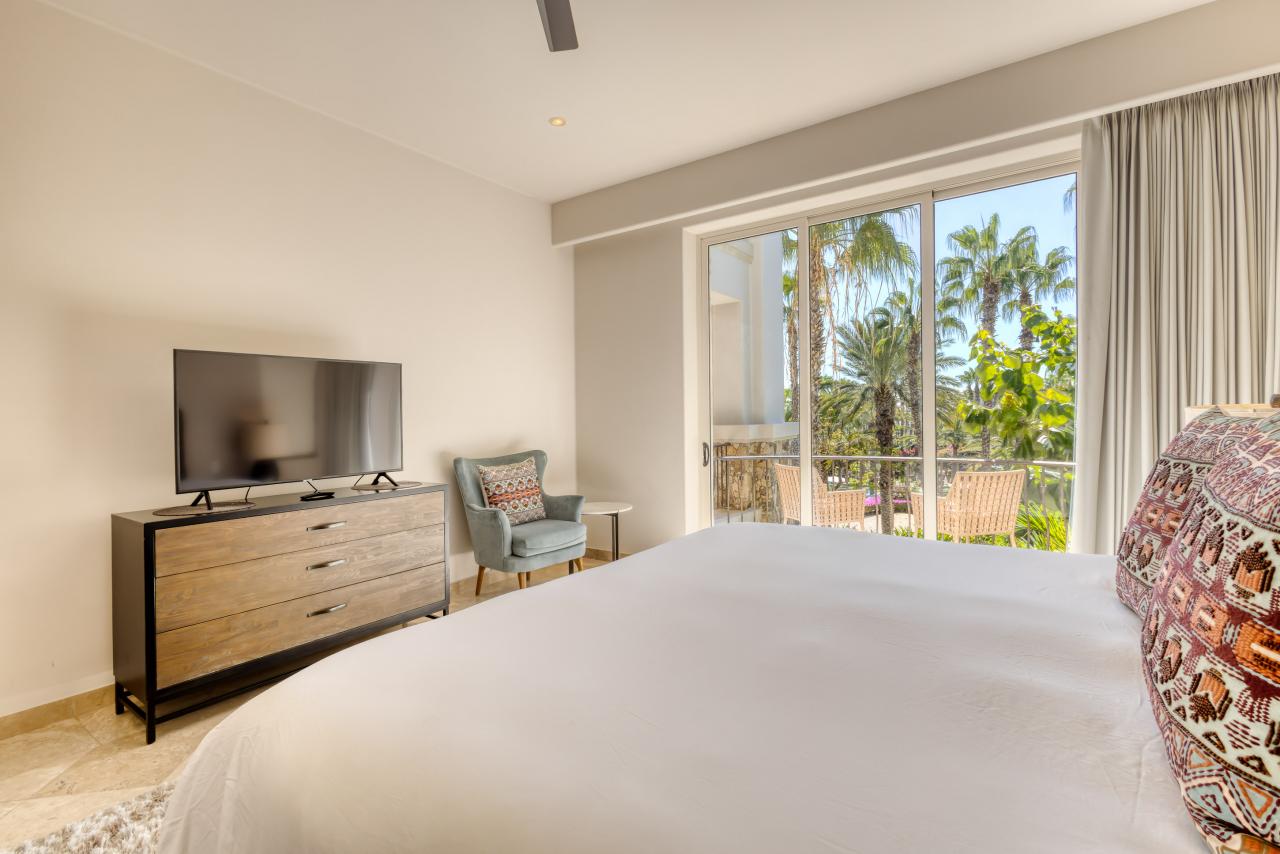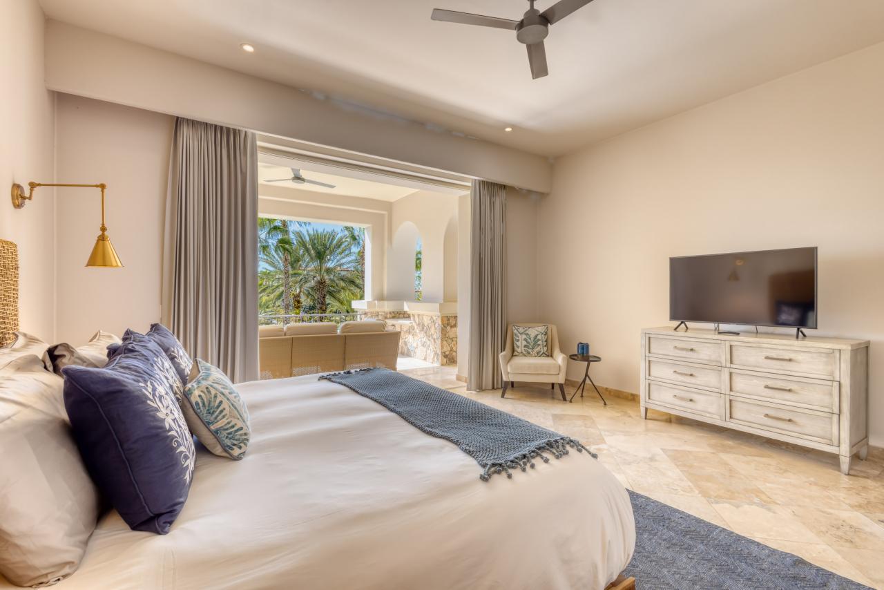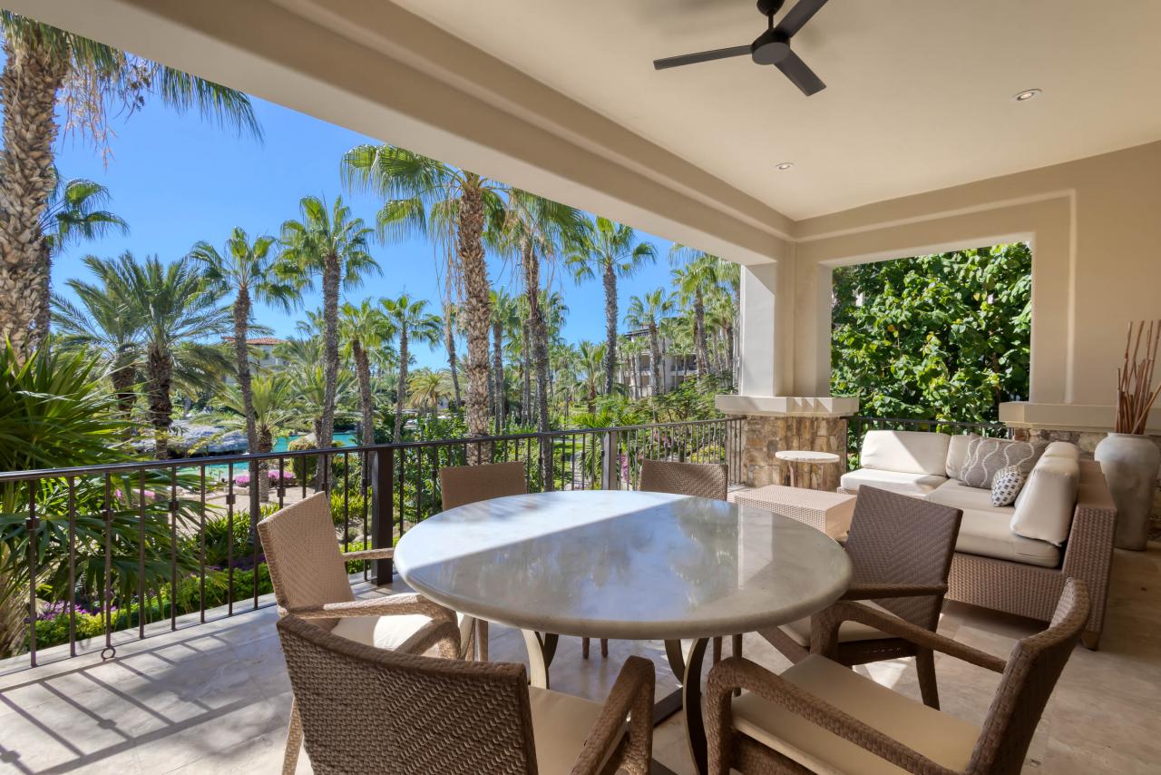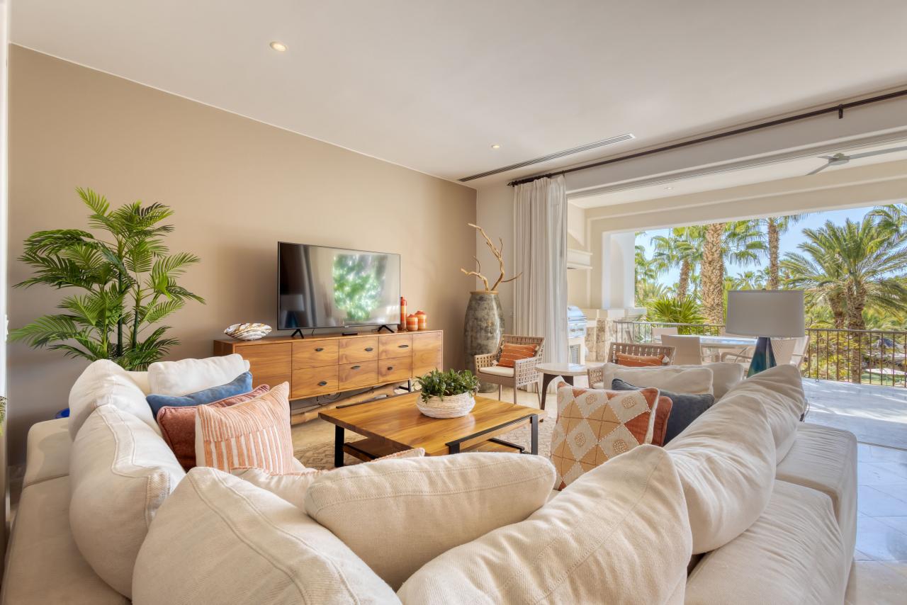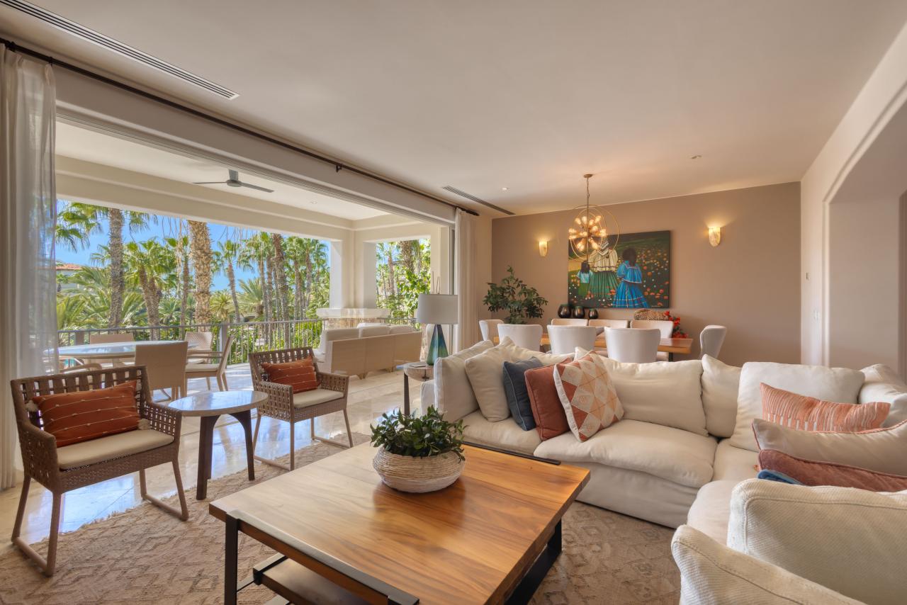 The open-concept living space is a highlight of this Las Estrellas 2603, anchored by a fully equipped gourmet kitchen with high-end stainless steel appliances. Guests can enjoy casual meals at the breakfast bar or gather around the dining table for eight, while the living area offers plush seating and a large TV for relaxed evenings. Sliding glass doors lead to a peaceful outdoor terrace overlooking the lush Esperanza grounds, complete with comfortable seating and dining space—perfect for morning coffee, alfresco dining, or unwinding in the warm Baja breeze.