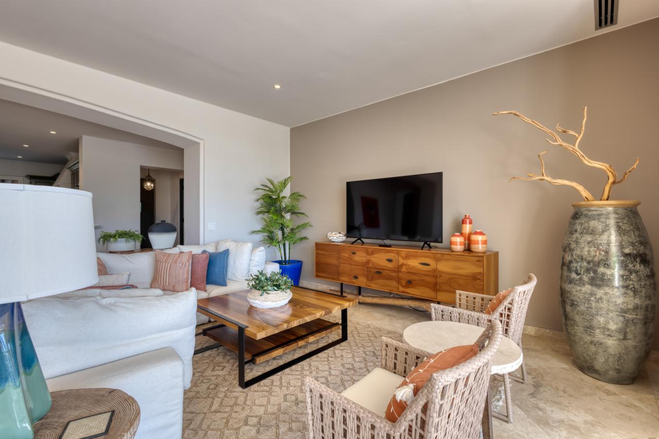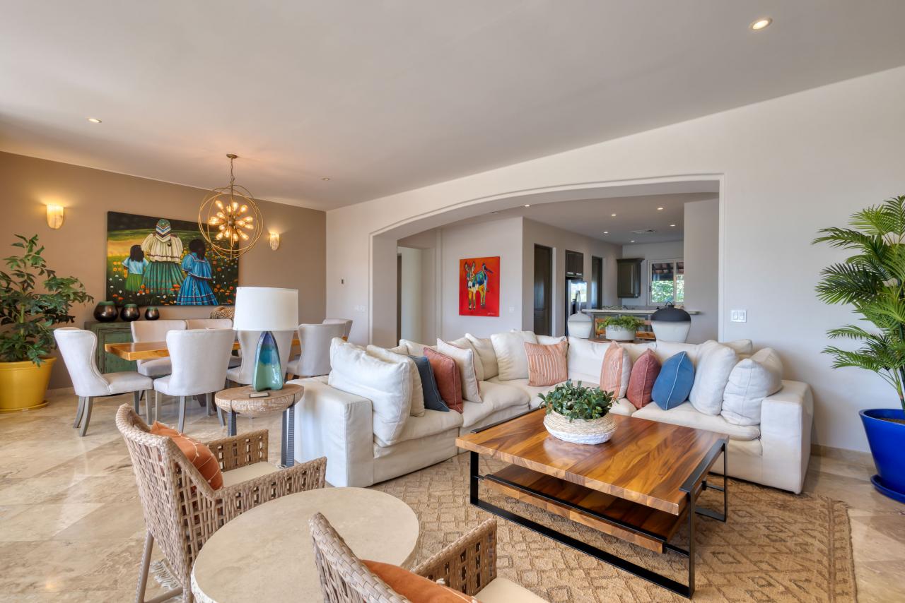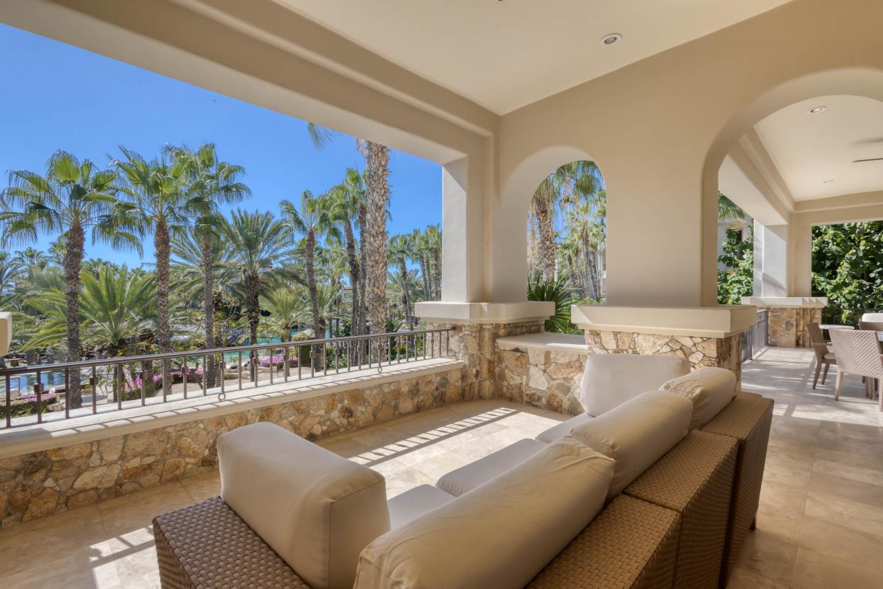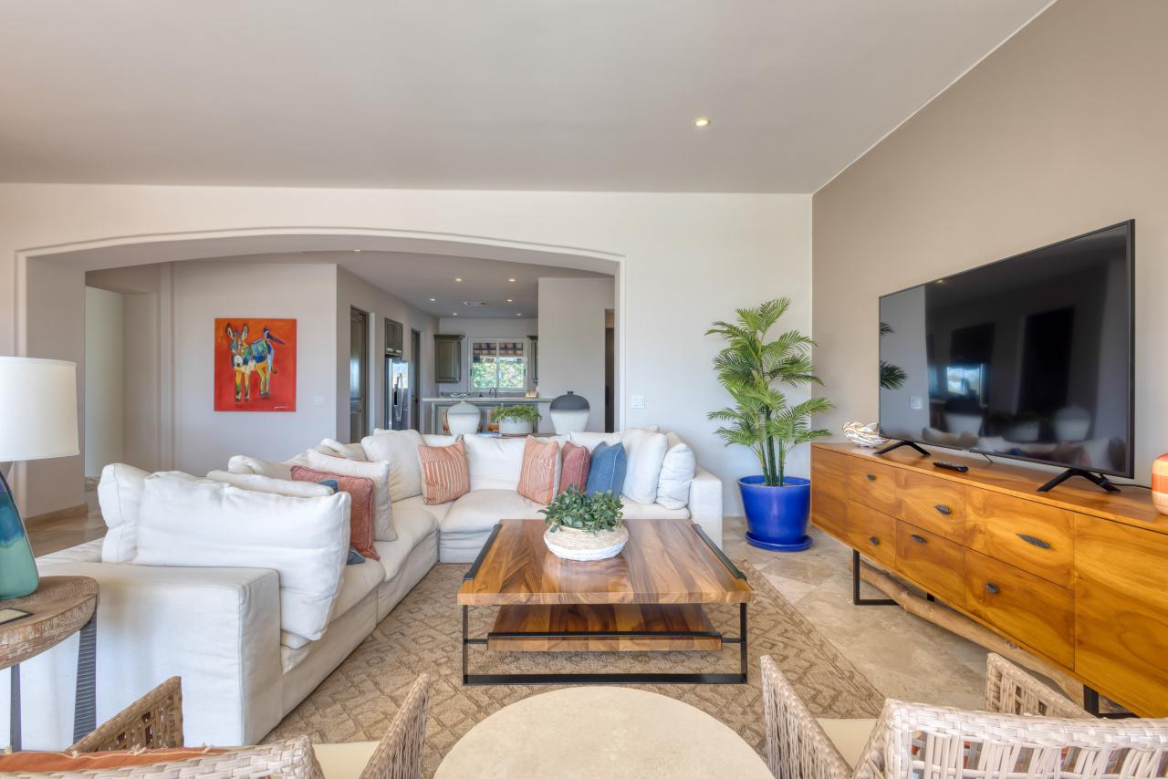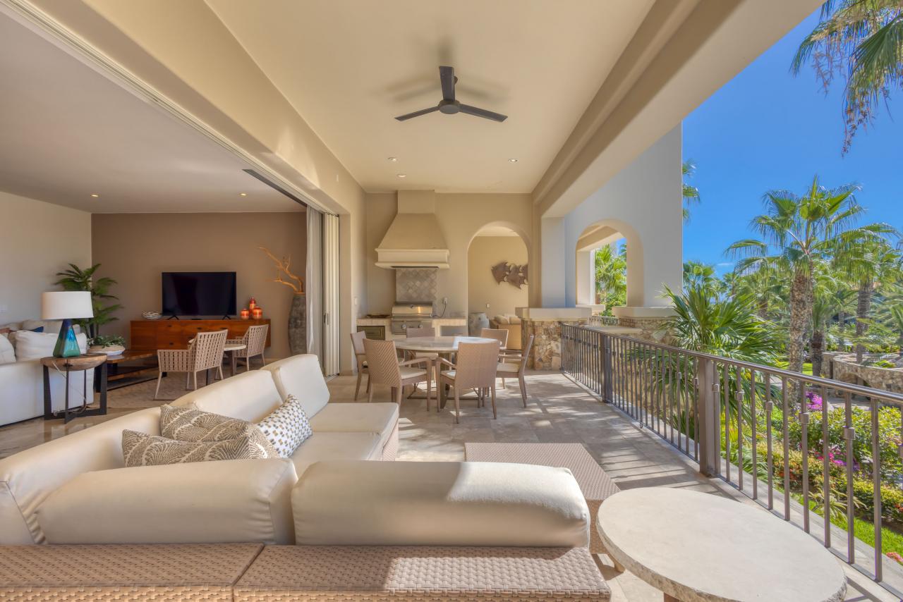 The open-concept living space is a highlight of this Las Estrellas 2603, anchored by a fully equipped gourmet kitchen with high-end stainless steel appliances. Guests can enjoy casual meals at the breakfast bar or gather around the dining table for eight, while the living area offers plush seating and a large TV for relaxed evenings. Sliding glass doors lead to a peaceful outdoor terrace overlooking the lush Esperanza grounds, complete with comfortable seating and dining space—perfect for morning coffee, alfresco dining, or unwinding in the warm Baja breeze.