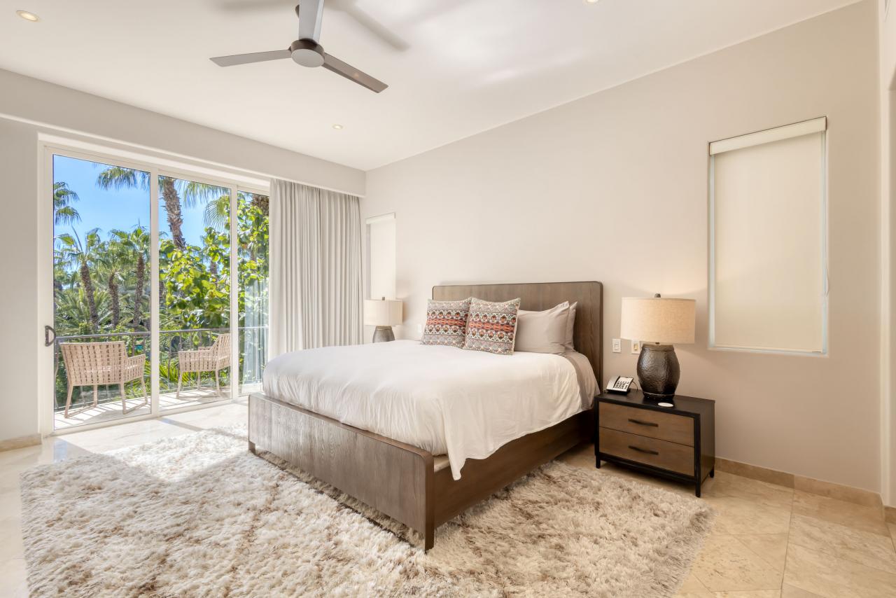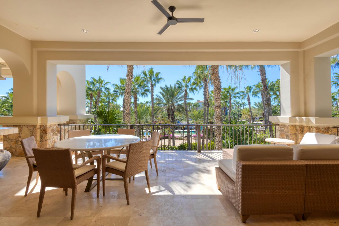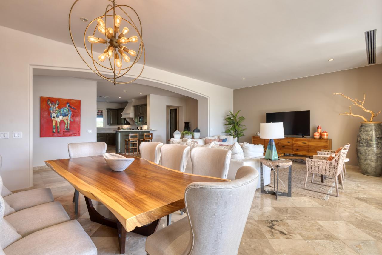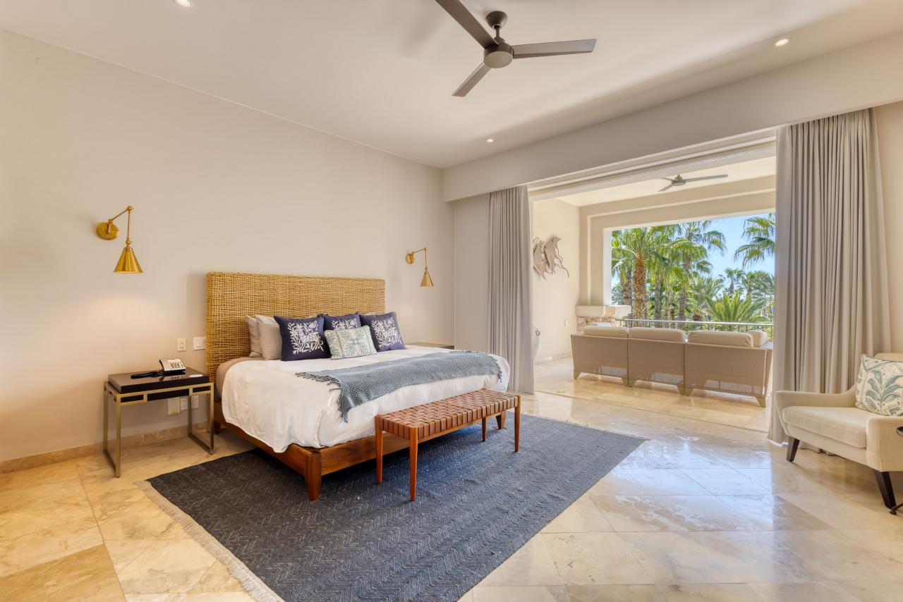 The open-concept living space is a highlight of this Las Estrellas 2603, anchored by a fully equipped gourmet kitchen with high-end stainless steel appliances. Guests can enjoy casual meals at the breakfast bar or gather around the dining table for eight, while the living area offers plush seating and a large TV for relaxed evenings. Sliding glass doors lead to a peaceful outdoor terrace overlooking the lush Esperanza grounds, complete with comfortable seating and dining space—perfect for morning coffee, alfresco dining, or unwinding in the warm Baja breeze.