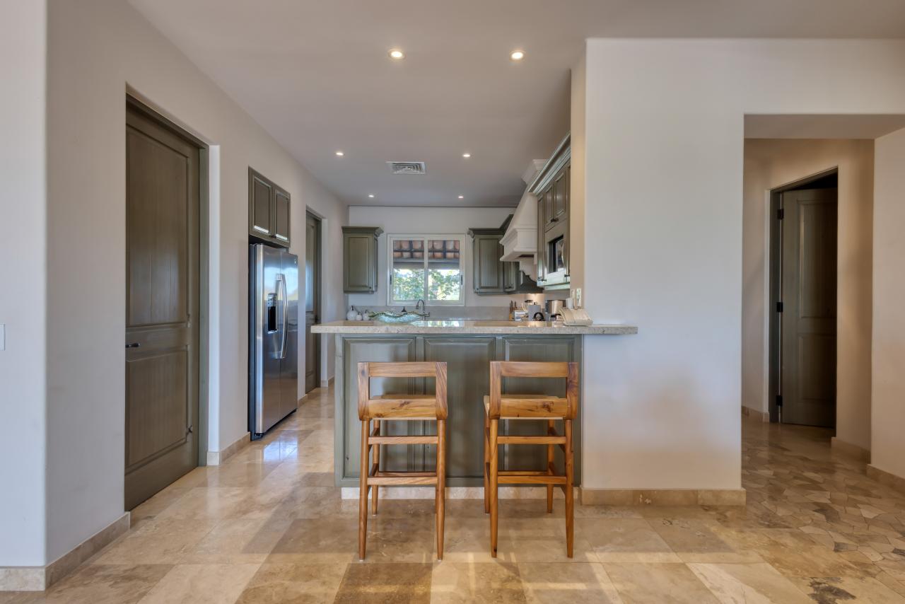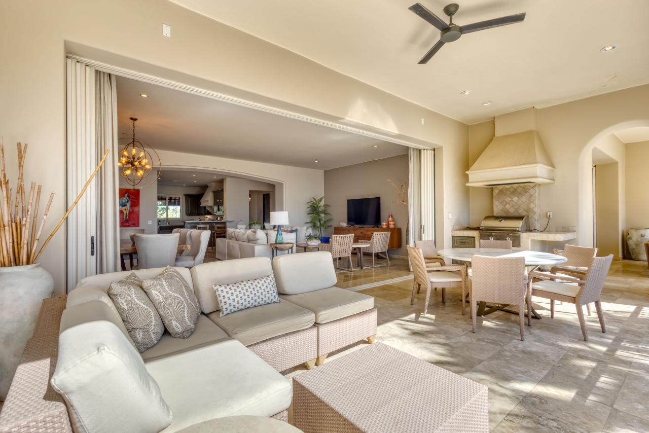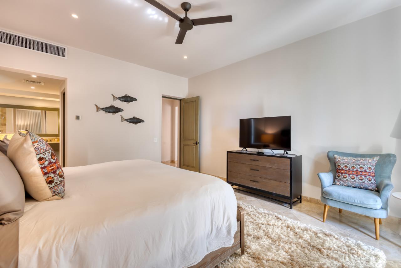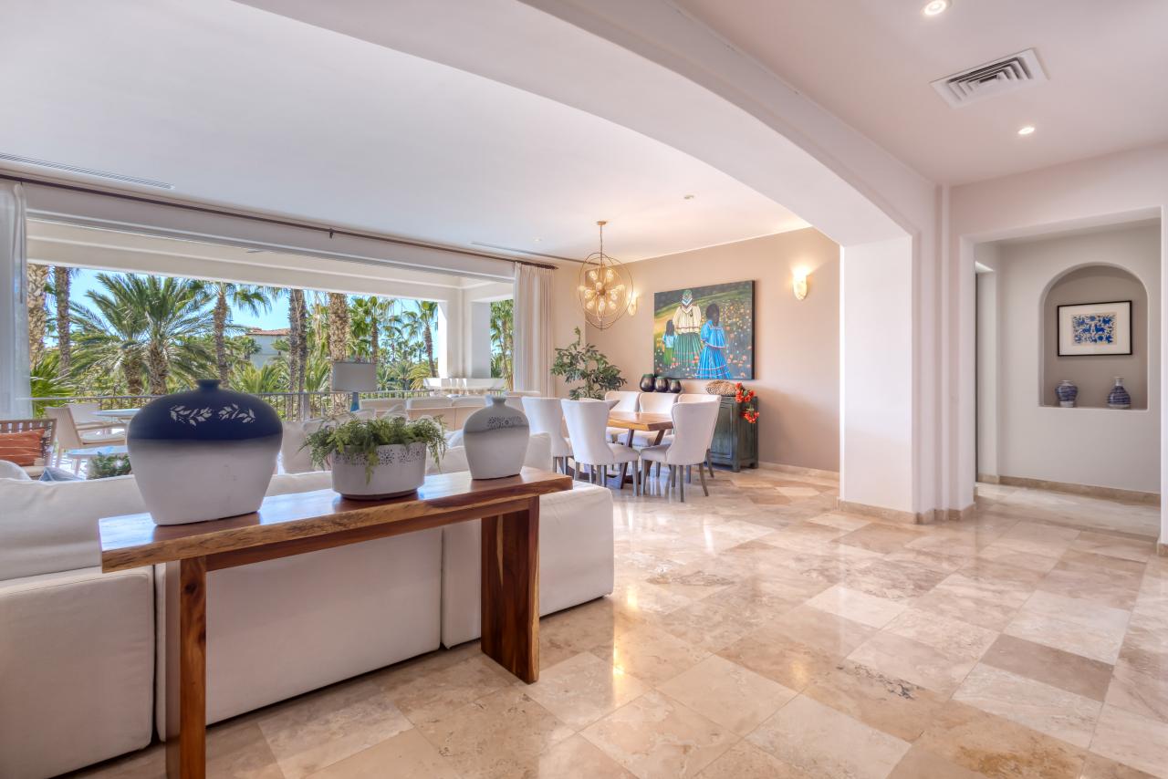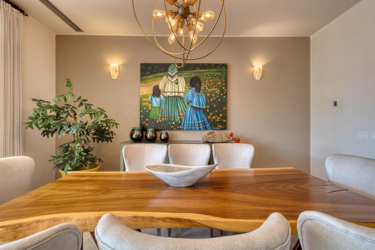 The open-concept living space is a highlight of this Las Estrellas 2603, anchored by a fully equipped gourmet kitchen with high-end stainless steel appliances. Guests can enjoy casual meals at the breakfast bar or gather around the dining table for eight, while the living area offers plush seating and a large TV for relaxed evenings. Sliding glass doors lead to a peaceful outdoor terrace overlooking the lush Esperanza grounds, complete with comfortable seating and dining space—perfect for morning coffee, alfresco dining, or unwinding in the warm Baja breeze.