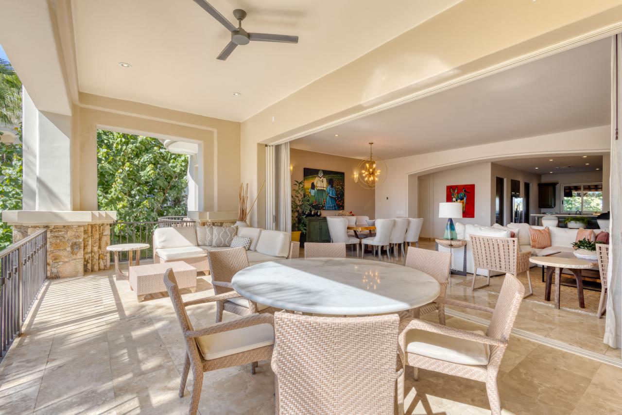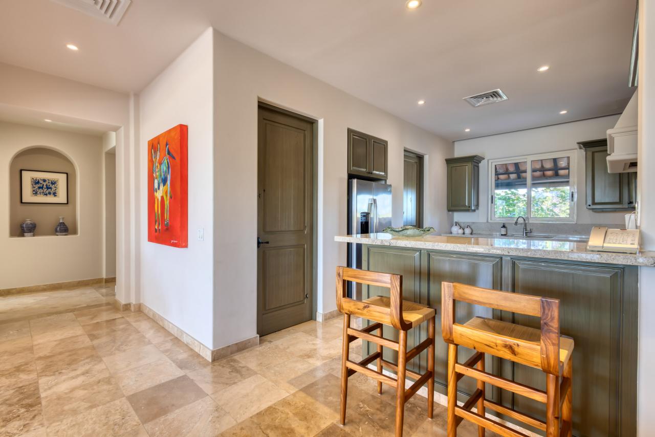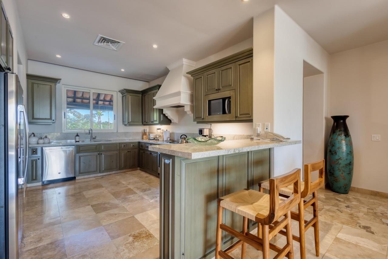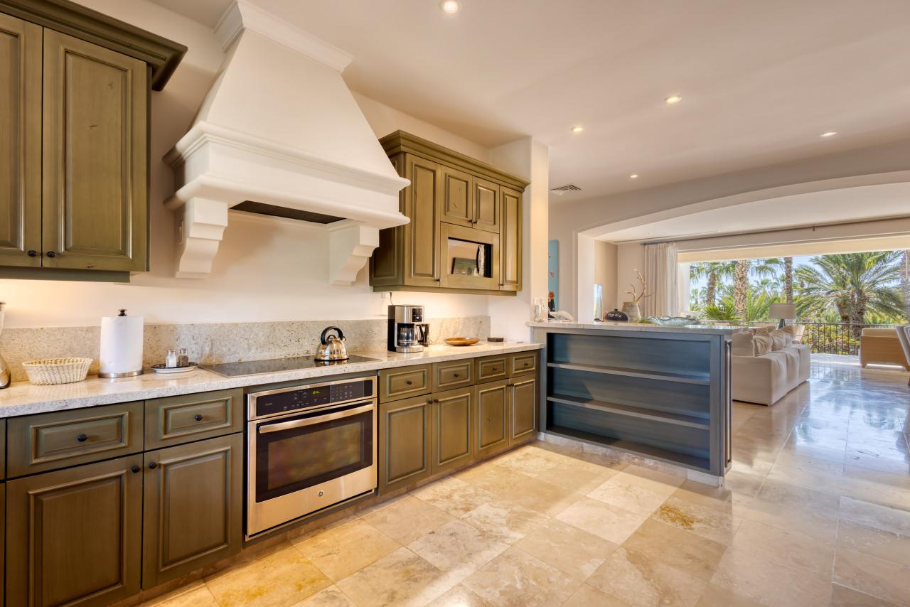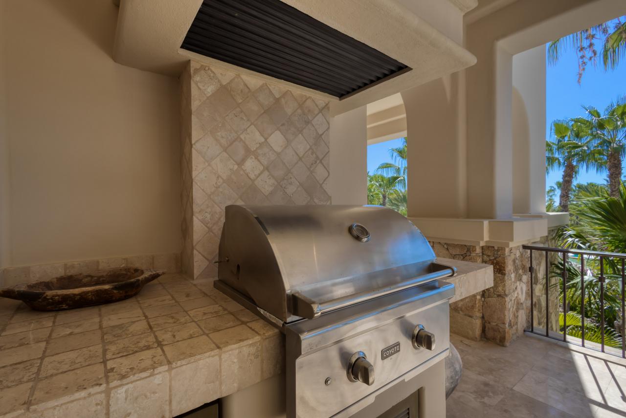 The open-concept living space is a highlight of this Las Estrellas 2603, anchored by a fully equipped gourmet kitchen with high-end stainless steel appliances. Guests can enjoy casual meals at the breakfast bar or gather around the dining table for eight, while the living area offers plush seating and a large TV for relaxed evenings. Sliding glass doors lead to a peaceful outdoor terrace overlooking the lush Esperanza grounds, complete with comfortable seating and dining space—perfect for morning coffee, alfresco dining, or unwinding in the warm Baja breeze.