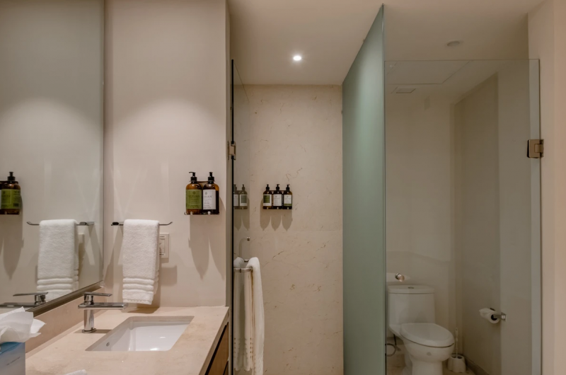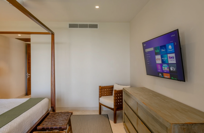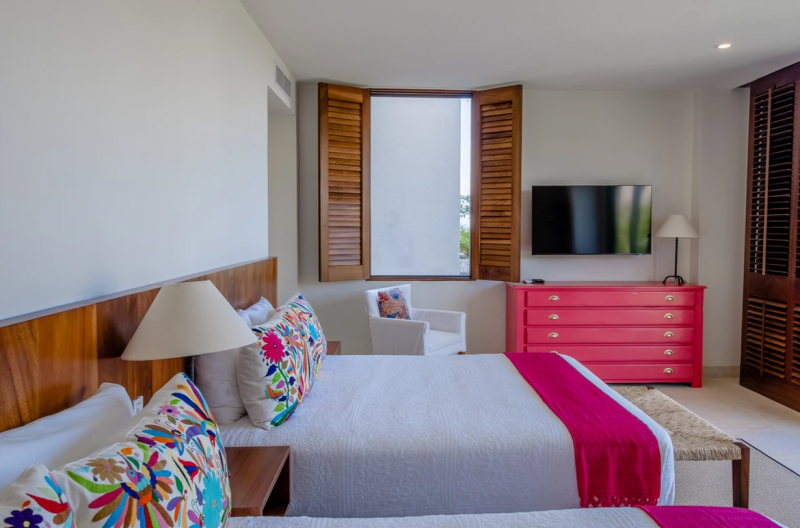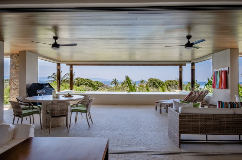 A luxurious condominium, Casa Lulu offers 3 bedrooms that can accommodate 8 guests. Located in the Tau development, this exclusive Punta Mita vacation rental is designed with plush, comfortable furniture that is arranged to promote conversation and relaxation, with rich fabrics and sophisticated patterns that add depth and texture. An area rug brings warmth to the seating area, while accent pillows and throws in complementary colors enhance the inviting atmosphere.