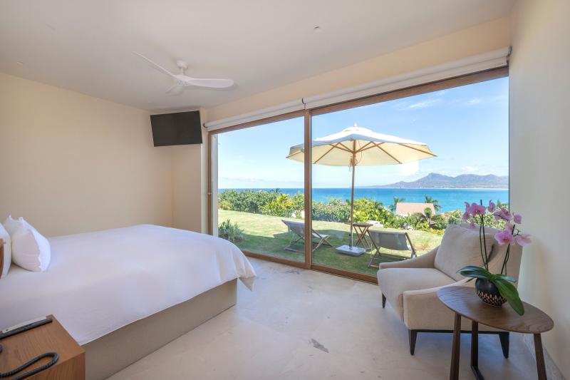 Primary Bedroom: King bed, TV, Desk, En-suite Bathroom (Oceanview shower), Closet, Ceiling Fan