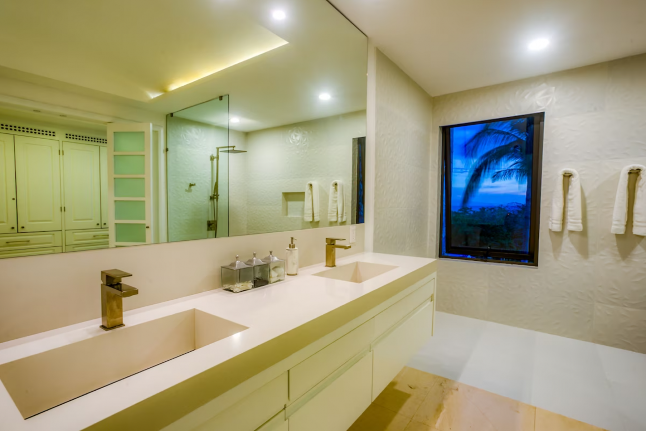 Primary Bedroom: The Primary Bedroom is equipped with a king-sized bed, a TV, air conditioning, and an ensuite bathroom.