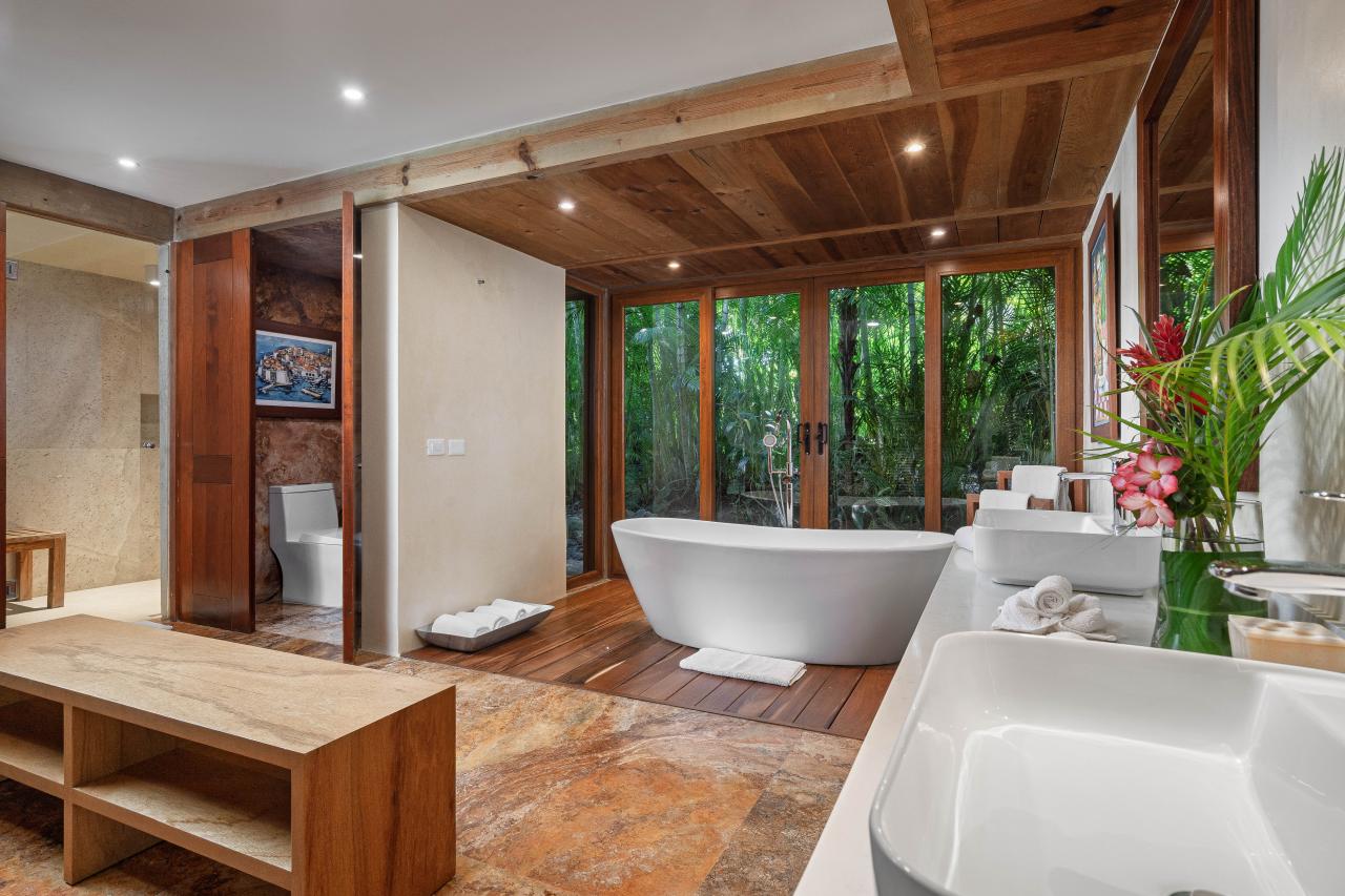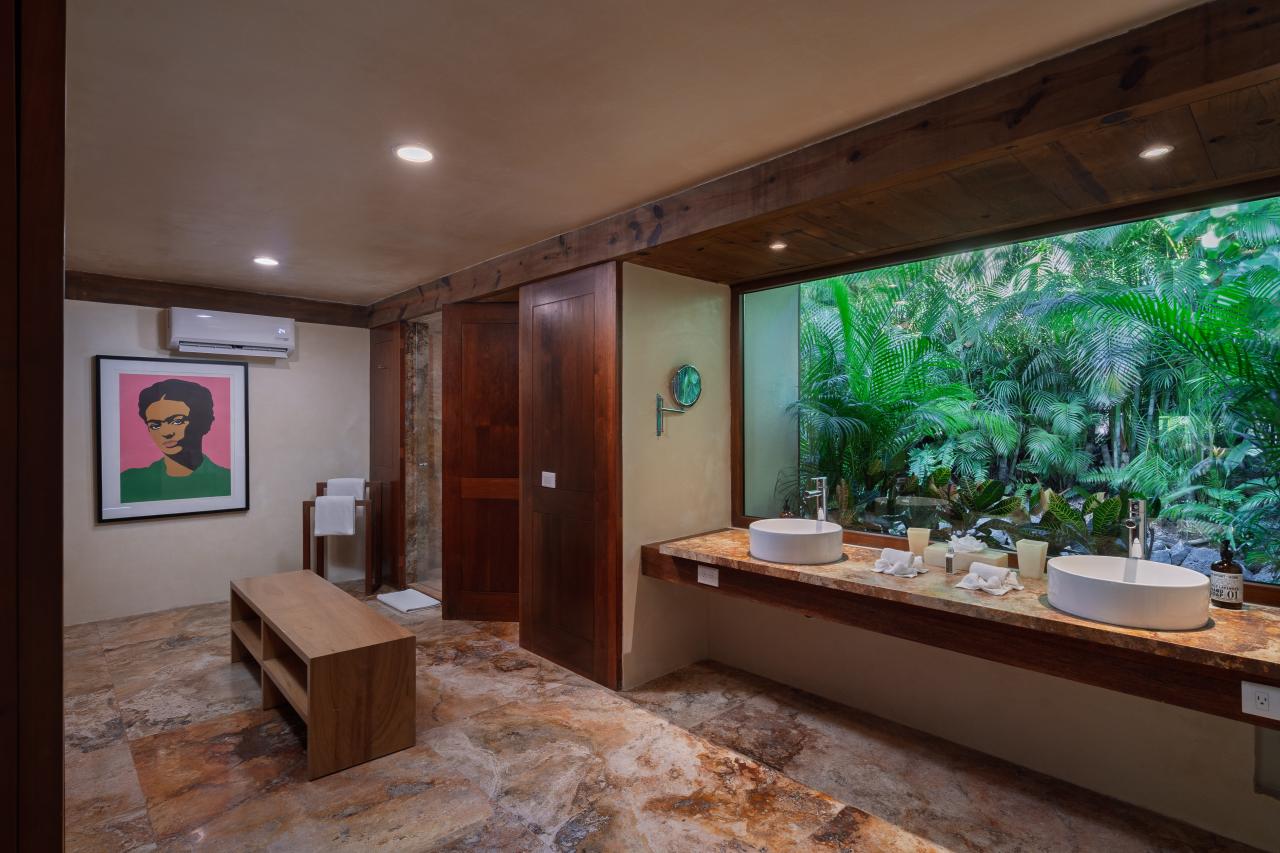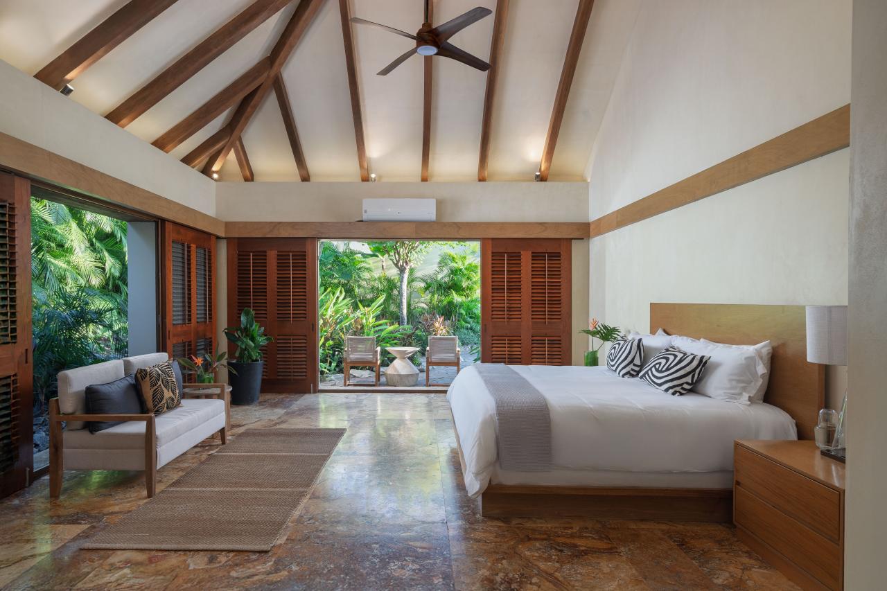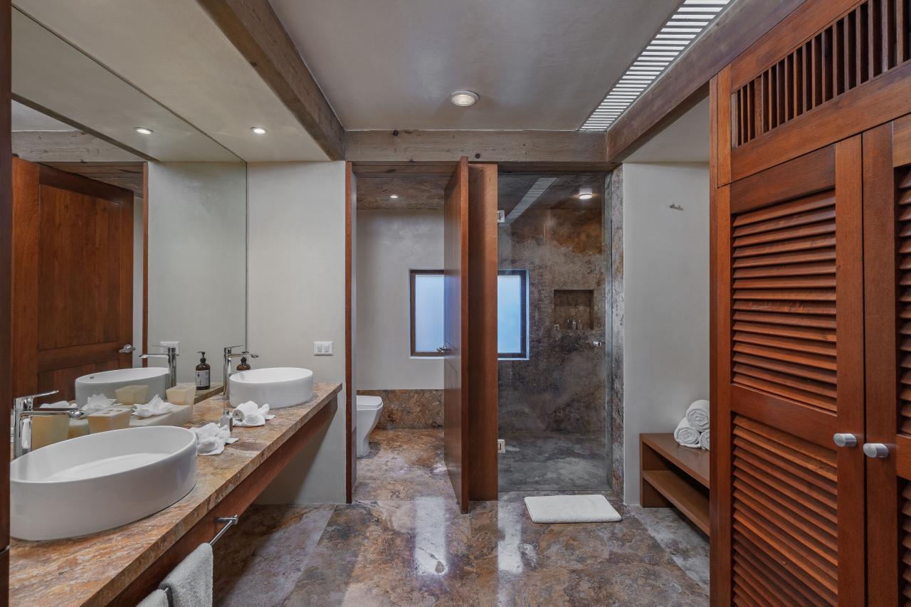 Villa el Jardin has four bedrooms, and each has an en-suite bathroom. The primary bedroom has a king-sized bed, a private terrace, and a luxurious bathroom with a soaking tub and a rain shower. The outdoor areas of Villa el Jardin are just as impressive as the inside areas. Guests can enjoy a relaxing pool overlooking the ocean, dine on the expansive palapa, or relax on the rooftop area. This Punta Mita villa also has landscaped gardens that add to the villa's serene and tropical ambiance.