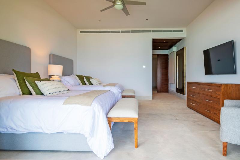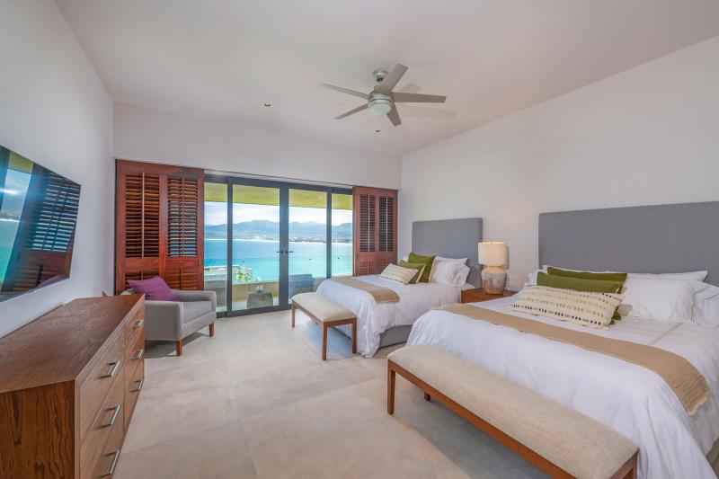 Bedroom 3: This room is equipped with two queen-sized beds, a TV, a terrace, an ocean view, and an ensuite bathroom.