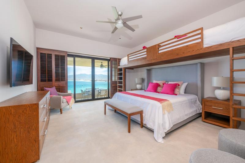 Bedroom 4: This room is equipped with bunk beds (a king-sized bed and two single-sized beds), a TV, a terrace, an ocean view, and an ensuite bathroom.