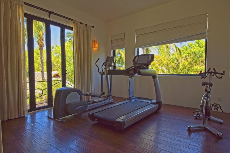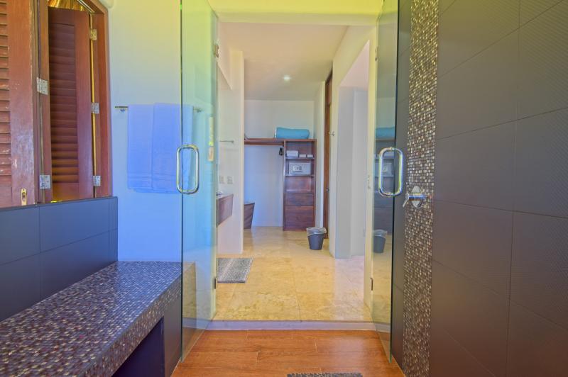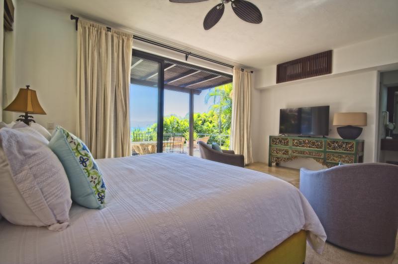 • Bedroom 1: Primary with king bed, en suite bathroom, AC, ceiling fan, office, living area, satellite TV, gym, wifi, ocean view, 2 private terraces