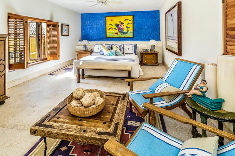 The Second suite is romantically Mexican with a four poster bed complete with billowy white drapery. Neutral tones throughout add to the special ambience of this room which is only enhanced by the breathtaking views from the king sized bed and private patio. The bathroom too is unique. A wall of shuttered windows open up to the view of the Pacific or can offer total privacy. An oversized tub, walk in shower and double vanities complete the Zen like experience.