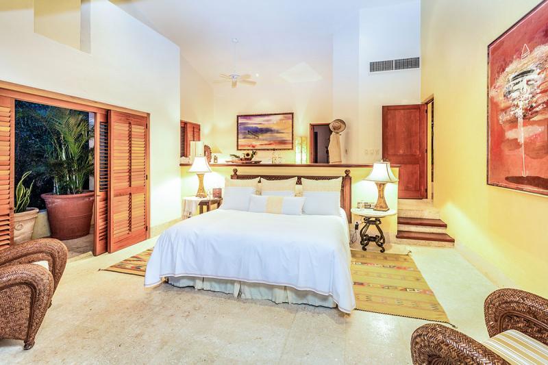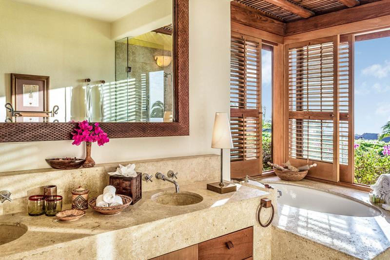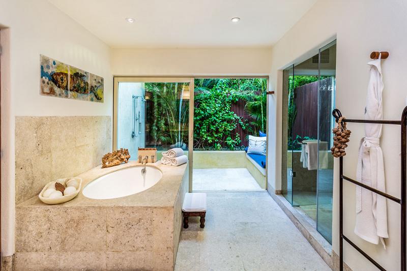 The master suite is a bi-level building with the king sized bed occupying the lower level ideally situated to enjoy the fabulous view across the private terrace over the Jacuzzi out to the Pacific Ocean. Enjoy the views from your patio day beds or swing in the hammock and take in the scenery. The upper area has a living/media space with 2 sofas, coffee table and desk. A wall of windows opens up to fully enjoy the breezes, this light airy room is perfect for relaxing or working. The Master bathroom is a large bright and sunny room with oversized tub, walk in shower, twin vanities and bidet. Sliding glass doors open to the large exterior shower complete with day bed. What better place to cool off after a hot shower, lie under the stars or relax before starting a strenuous day on the beach.