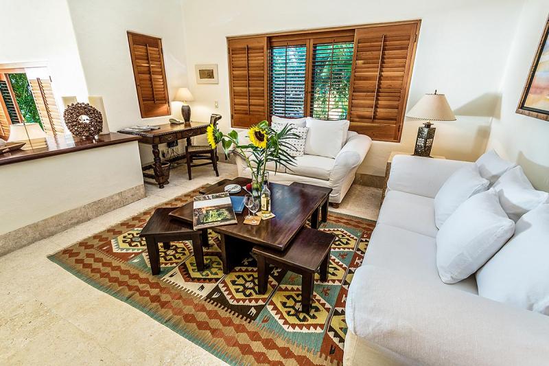 The Third suite has two twin beds that can be seamlessly put together to make a king. A totally secluded patio with 2 day beds is a wonderful retreat to read, nap or contemplate your next excursion. The stunning bathroom with a walk in shower is done in local Tekul stone that adds a rosy glow to any tan. Double Copper sink vanities and hand carved Mexican mirrors all add to the ambience.
