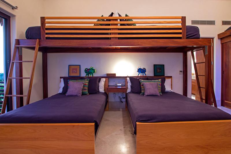 Bedroom 3: This room has two full-sized beds, two single beds (bunk beds), air-conditioning, and an ensuite bathroom.