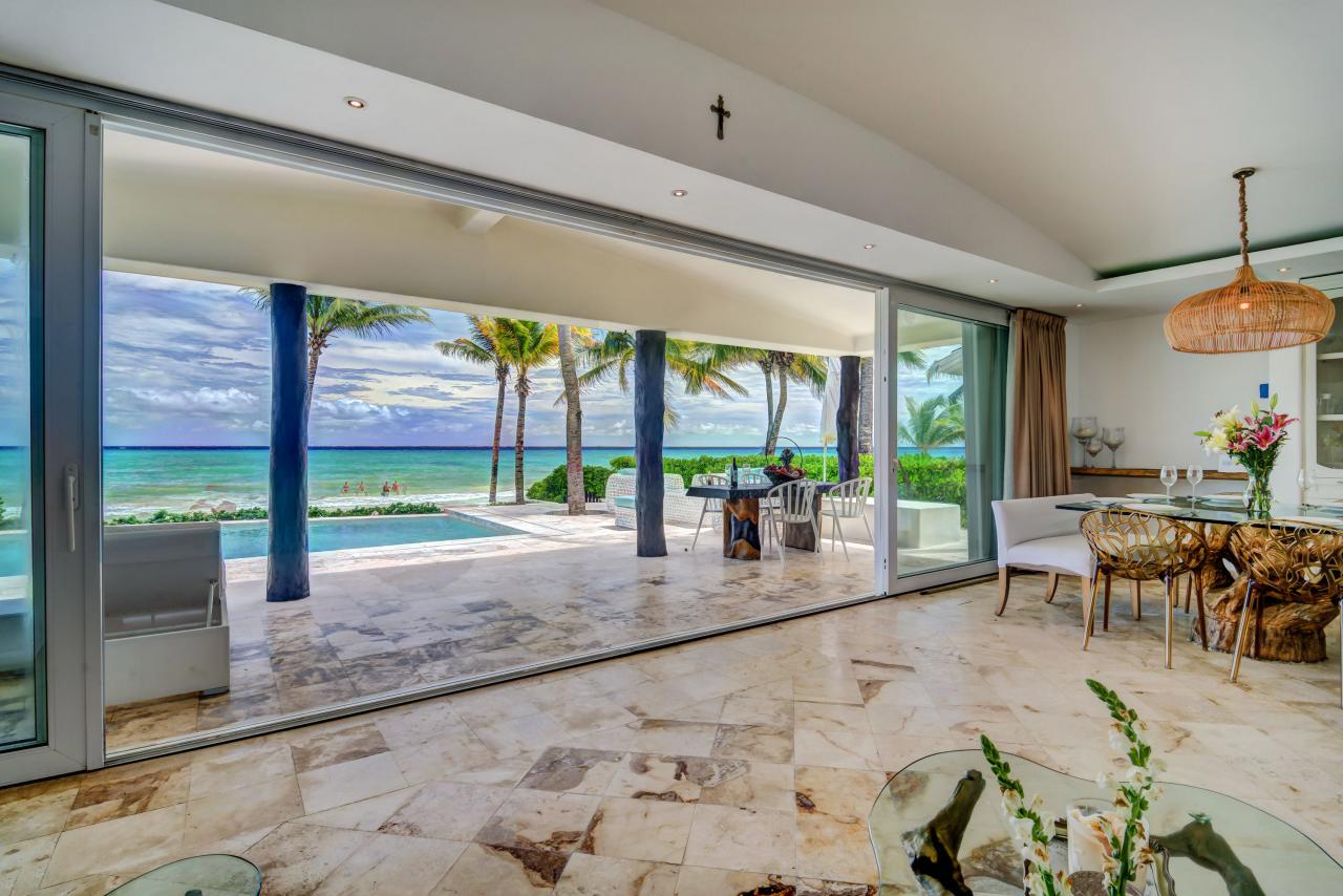 Casa Caramelo is an exceptionally bright, spacious, and elegant beachfront house with an entire wall of windows to enjoy unbeatable Caribbean Sea views from the living room, dining room, kitchen, master bedroom, TV room, and oversized terrace.This gorgeous home features a brand-new swimming pool and quality wooden lounge chairs and patio furniture perfect for a group to enjoy a Mexican vacation in a beachfront dream house.