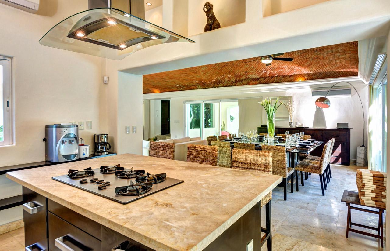 Villa Saasil it is one of the best Playa del Carmen rental properties on the market today. Its three-level pool is surrounded by wooden floors that start right outside the living room. The relaxing sound of cascading water is perfect for an afternoon nap in hammock, set right over the water. The first level of the pool, just a few inches deep, is a great place to relax under a wood log ceiling. The spacious living room with arched red brick ceiling has an open loft design that offers panoramic views of the golf course.